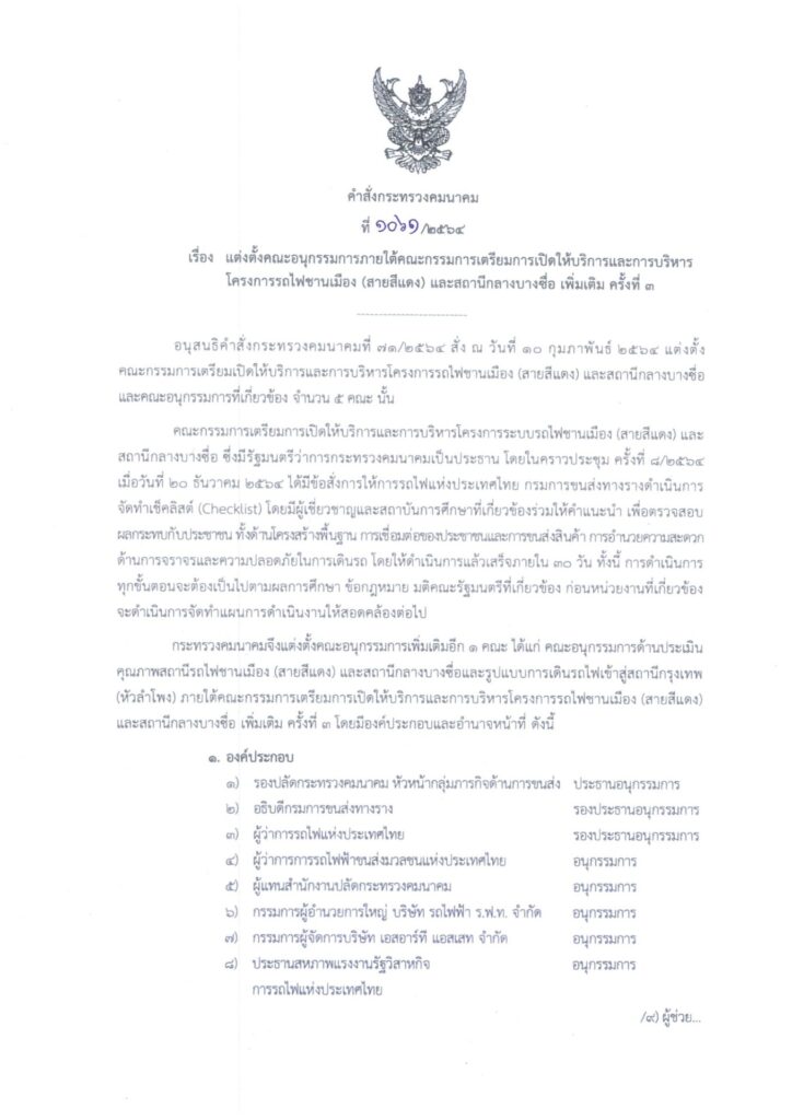 กรุงเทพฯ 25 ธ.ค. -รมว.คมนาคม ลงนามแล้ว ตั้งคณะอนุกรรมการฯ อีก 1 ชุด กำกับการเช็กลิสต์ รูปแบบการเดินขบวนรถไฟ เข้าสถานีรถไฟหัวลำโพง หลังก่อนหน้านี้ ตั้งเป้าหมายกำหนดการทำงาน ให้แล้วเสร็จภายใน 30 วัน