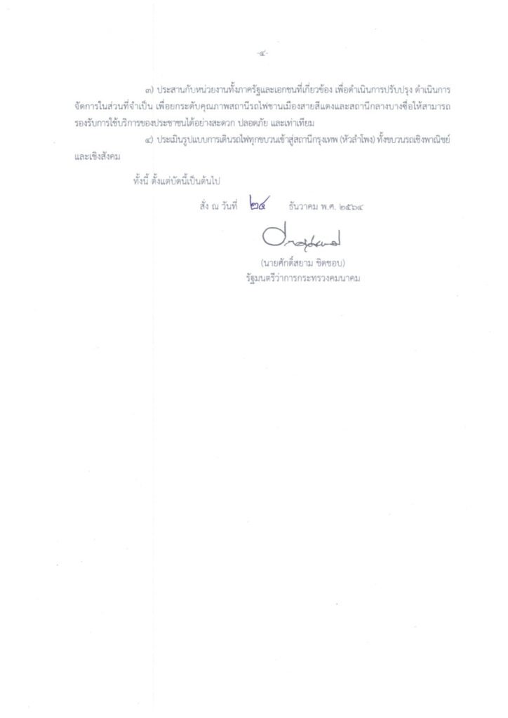 3 ) ประสานกับหน่วยงานทั้งภาครัฐและเอกชนที่เกี่ยวข้อง เพื่อดำเนินการปรับปรุง ดำเนินการจัดการในส่วนที่จำเป็น เพื่อยกระดับคุณภาพสถานีรถไฟชานเมืองสายสีแดงและสถานีกลางบางซื่อให้สามารถรองรับการใช้บริการของประชาชนได้อย่างสะดวก ปลอดภัย และเท่าเทียม และ