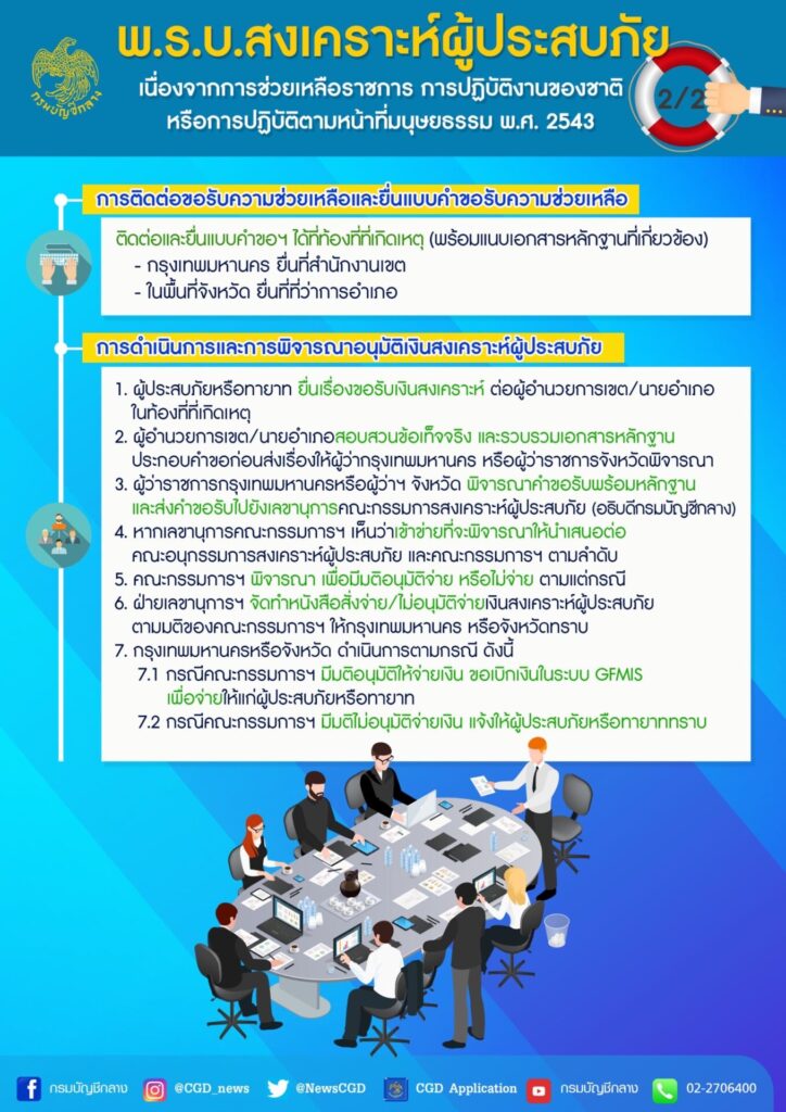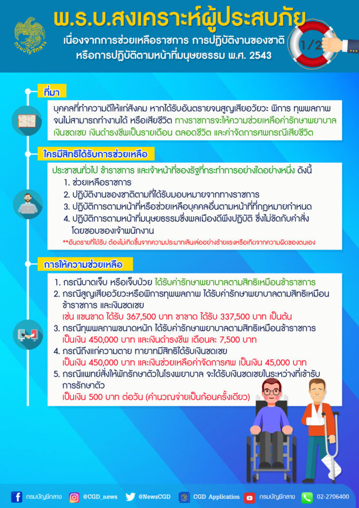 “สำหรับ พ.ร.บ.สงเคราะห์ผู้ประสบภัยฯ มีวัตถุประสงค์เพื่อช่วยเหลือผู้ที่ทำความดีให้แก่สังคม ประกอบด้วย การช่วยเหลือราชการด้วยความสมัครใจ หรือทางราชการร้องขอโดยไม่หวังผลตอบแทนใด ๆ จากทางราชการ การปฏิบัติงานของชาติตามที่ได้รับมอบหมายจากทางราชการ การปฏิบัติตามหน้าที่หรือช่วยเหลือผู้อื่นตามที่กฎหมายกำหนด และการปฏิบัติหน้าที่เป็นพลเมืองดี เช่น ช่วยเหลือคนตกน้ำ ช่วยสกัดคนร้าย เป็นต้น โดยหากผู้นั้นได้รับอันตรายจนสูญเสียอวัยวะ พิการ ทุพพลภาพ จนไม่สามารถทำงานได้หรือถึงแก่ความตาย และครอบครัวได้รับความเดือดร้อน พ.ร.บ.สงเคราะห์ผู้ประสบภัยฯ ได้กำหนดการให้ความช่วยเหลือเบื้องต้น ดังนี้ ค่ารักษาพยาบาล เงินชดเชยเป็นก้อน กรณีทุพพลภาพจะได้รับเงินดำรงชีพเป็นรายเดือนตลอดชีวิต หรือกรณีถึงแก่ความตายจะได้รับค่ารักษาพยาบาลก่อนถึงแก่ความตาย เงินชดเชย และเงินช่วยเหลือค่าจัดการศพ ทั้งนี้ หากมีข้อสงสัยสอบถามเพิ่มเติมได้ที่ Call Center กรมบัญชีกลาง 02 270 6400 ในวัน เวลาราชการ” โฆษกกรมบัญชีกลาง กล่าว.-สำนักข่าวไทย
