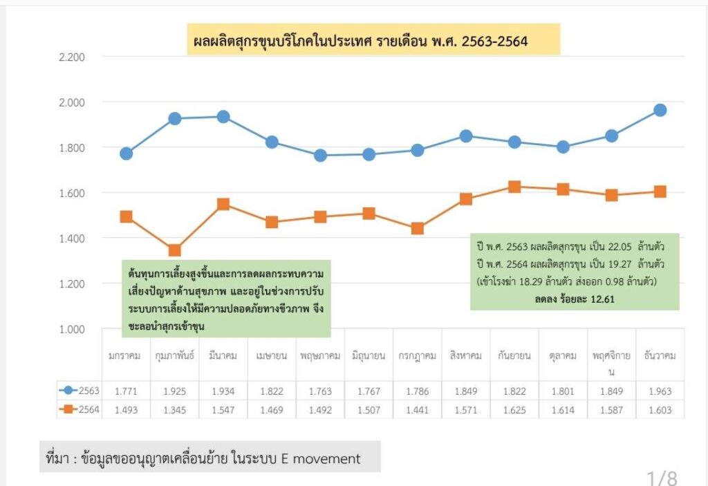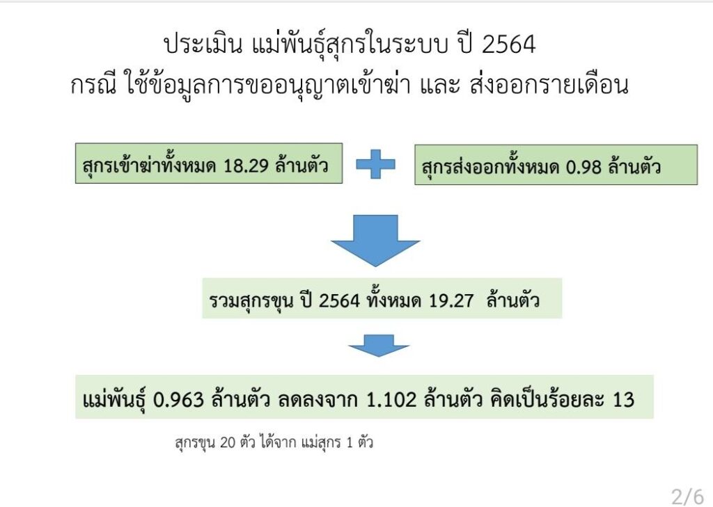 สำหรับการประเมินจำนวนสุกรทั้งประเทศในปี 2564 จากการขออนุญาตเข้าฆ่าและส่งออกพบว่า รวมสุกรขุนทั้งประเทศ 19.27 ล้านตัวแบ่งเป็น สุกรเข้าฆ่า 18.29 ล้านตัวและส่งออก 0.98 ล้านตัว หรือลดลงร้อยละ 13.- สำนักข่าวไทย