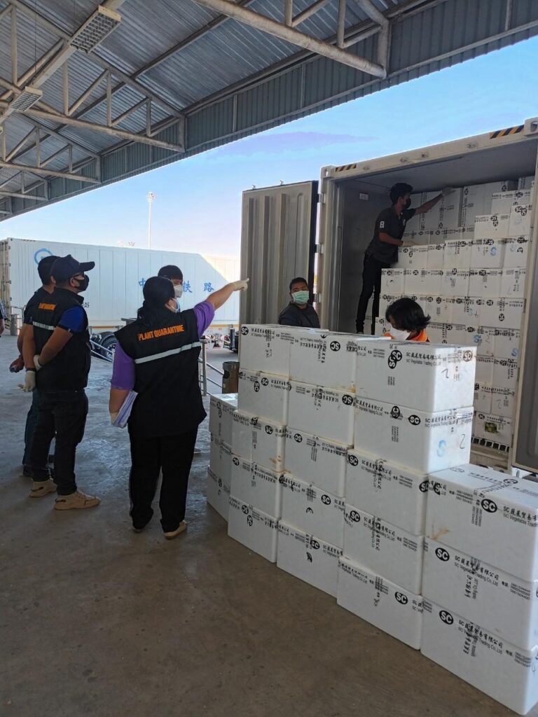 นายภัสชญภณ หมื่นแจ้ง รองอธิบดีกรมวิชาการเกษตรเปิดเผย ตั้งแต่วันที่ 3 ธันวาคม 2564 – วันที่ 3 มกราคม 2565 ด่านตรวจพืชหนองคาย กรมวิชาการเกษตรรายงานการตรวจสินค้านำเข้าจากจีนมีปริมาณการนำเข้าผ่านด่านตรวจพืชหนองคาย 159 ชิปเม้นท์ ปริมาณรวม 2,292 ตัน มูลค่ารวม 41 ล้านบาท