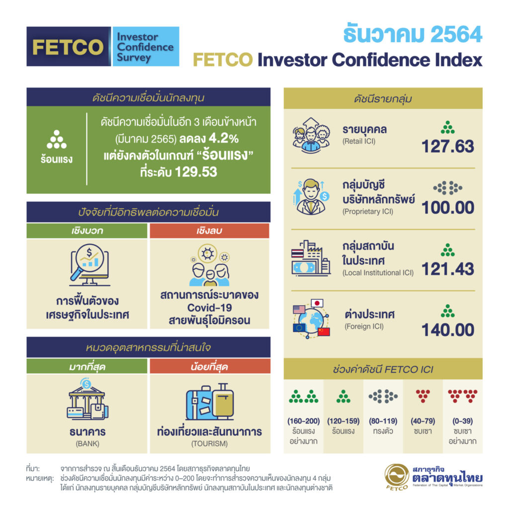 นายไพบูลย์ นลินทรางกูร ประธานกรรมการสภาธุรกิจตลาดทุนไทย เปิดเผยดัชนีความเชื่อมั่นนักลงทุน (FETCO Investor Confidence Index) ผลสำรวจในเดือนธันวาคม 2564 พบว่า “ดัชนีความเชื่อมั่นนักลงทุน (FETCO Investor Confidence Index: ICI) ในอีก 3 เดือนข้างหน้า อยู่ที่ระดับ 129.53 ปรับตัวลดลง 4.2% จากเดือนก่อนหน้าและยังคงอยู่ในเกณฑ์ “ร้อนแรง” นักลงทุนคาดหวังการฟื้นตัวของเศรษฐกิจในประเทศเป็นปัจจัยหนุนมากที่สุด รองลงมาคือการไหลเข้าของเงินทุน และผลประกอบการบริษัทจดทะเบียน สำหรับปัจจัยที่ฉุดความเชื่อมั่นนักลงทุนมากที่สุด ได้แก่ ความกังวลต่อสถานการณ์ระบาดของ Covid-19 สายพันธุ์โอมิครอน รองลงมาคือสถานการณ์ความขัดแย้งระหว่างประเทศและผลการประชุมอัตราดอกเบี้ยนโยบายของคณะกรรมการนโยบายการเงิน (กนง.)