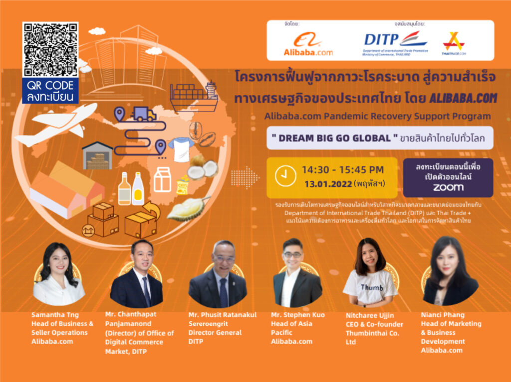 นายภูสิต รัตนกุล เสรีเริงฤทธิ์ อธิบดีกรมส่งเสริมการค้าระหว่างประเทศ (DITP) กระทรวงพาณิชย์ เปิดเผยว่า กรมฯ ได้ดำเนินการตามนโยบายนายจุรินทร์ ลักษณวิศิษฏ์ รองนายกรัฐมนตรีและรัฐมนตรีว่าการกระทรวงพาณิชย์ ที่ได้สั่งการให้เพิ่มช่องทางและโอกาสในการขยายตลาดต่างประเทศด้วยการค้าออนไลน์ให้กับผู้ประกอบการขนาดกลางและเล็ก (SMEs) ของไทย โดยกรมฯ โดย Thaitrade.com ได้ร่วมมือกับ Alibaba.com แพลตฟอร์มการค้าออนไลน์ชั้นนำของโลก จัดกิจกรรม Webinar เพื่อช่วยส่งเสริมให้ผู้ประกอบการไทยสามารถส่งออกสินค้าไปได้ทั่วโลก กำหนดจัดขึ้นในวันที่ 13 ม.ค.2565 ผ่านระบบ Zoom เวลา 14.30–15.45 น.
