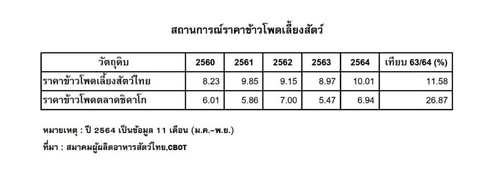 สมาคมผู้ผลิตอาหารสัตว์ไทยคาดการณ์ว่า ราคาวัตถุดิบอาหารสัตว์ไตรมาสแรกของปี 2565 จะยังพุ่งสูงขึ้นอีก จากข้อมูลตั้งแต่เดือนมกราคม-พฤศจิกายน 2564 เทียบกับช่วงเวลาเดียวกันปี 2563 ข้าวโพดเลี้ยงสัตว์ราคาสูงขึ้น 11.58% กากถั่วเหลือง 27.90% มันสำปะหลัง 8.41% ข้าวสาลี 20.73% และข้าวบาร์เลย์ 8.69% สำหรับราคาข้าวโพดเลี้ยงสัตว์ตลาดชิคาโกปี 2564 สูงขึ้นกว่าปี 2563 ถึง 26.87%