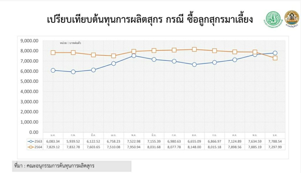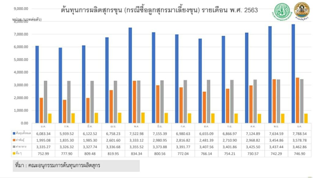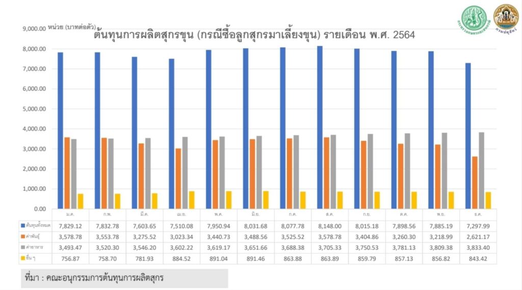 คณะอนุกรรมการต้นทุนการผลิตสุกรของคณะกรรมการนโยบายพัฒนาสุกรและผลิตภัณฑ์ (Pig Board) คำนวณต้นทุนการผลิตสุกรรายเดือน โดยแบ่งเป็น ค่าพันธุ์ ค่าอาหาร และอื่นๆ ซึ่งปรากฏว่า ค่าอาหารสัตว์ตั้งแต่เดือนมกราคมถึงธันวาคม 2564 ปรับสูงขึ้นอย่างต่อเนื่อง เมื่อเปรียบเทียบกับปี 2563พบว่า ปี 2564 ต้นทุนค่าอาหารสัตว์สูงกว่าเฉลี่ย 8% ทำให้ภาพรวมต้นทุนการผลิตสุกรสูงขึ้น