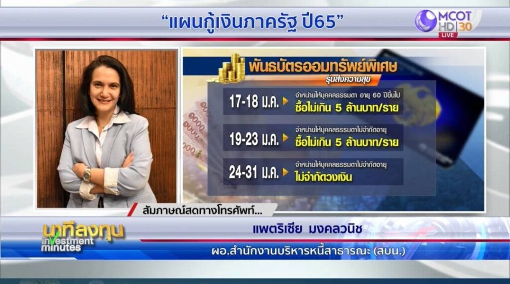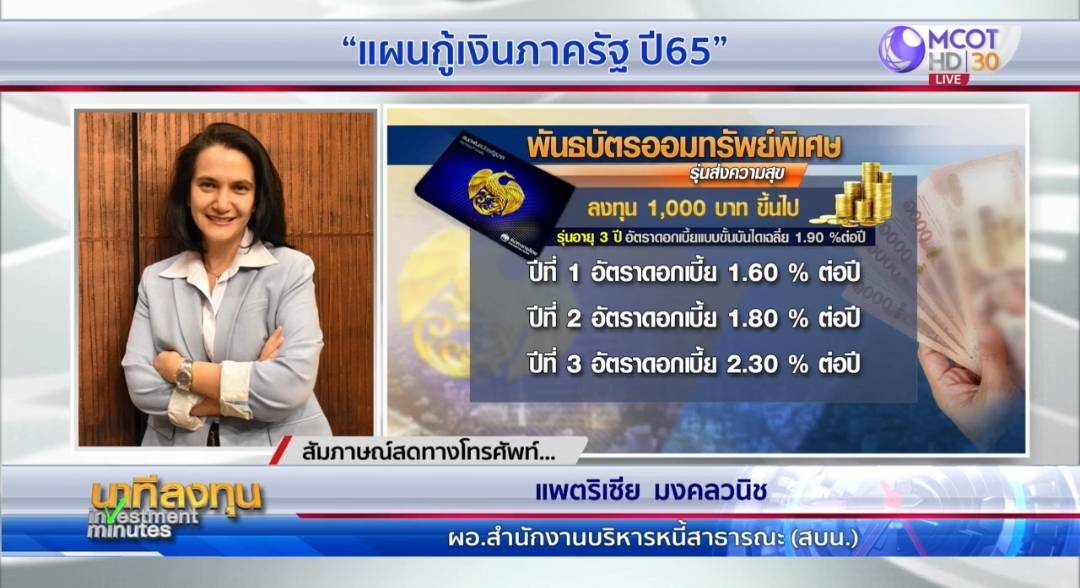 นางแพตริเซีย กล่าวถึง การเริ่มจำหน่ายพันธบัตรออมทรัพย์พิเศษ “รุ่นส่งความสุข” เพื่อเป็นของขวัญปีใหม่ให้กับพี่น้องประชาชนเริ่ม 17 -31 ม.ค.นี้ วงเงิน 3 หมื่นล้านบาท ว่าเป็นรุ่นพิเศษที่จะเน้นจำหน่ายผู้สูงอายุซึ่งเป็นลูกค้าหลักของพันธบัตรรัฐบาล จึงจำหน่ายผ่านช่องทาง Counter Internet Banking และ Mobile Banking ของธนาคารตัวแทนจำหน่าย 4 แห่ง ได้แก่ ธ.กรุงเทพ กรุงไทย กสิกรไทย และไทยพาณิชย์ โดยไม่ได้จำหน่ายผ่านวอลเล็ต สบม. อย่างไรก็ตาม ในอนาคต ทาง สบน.ก็จะเน้นการใช้ วอลเล็ต สบม.เพิ่มขึ้น