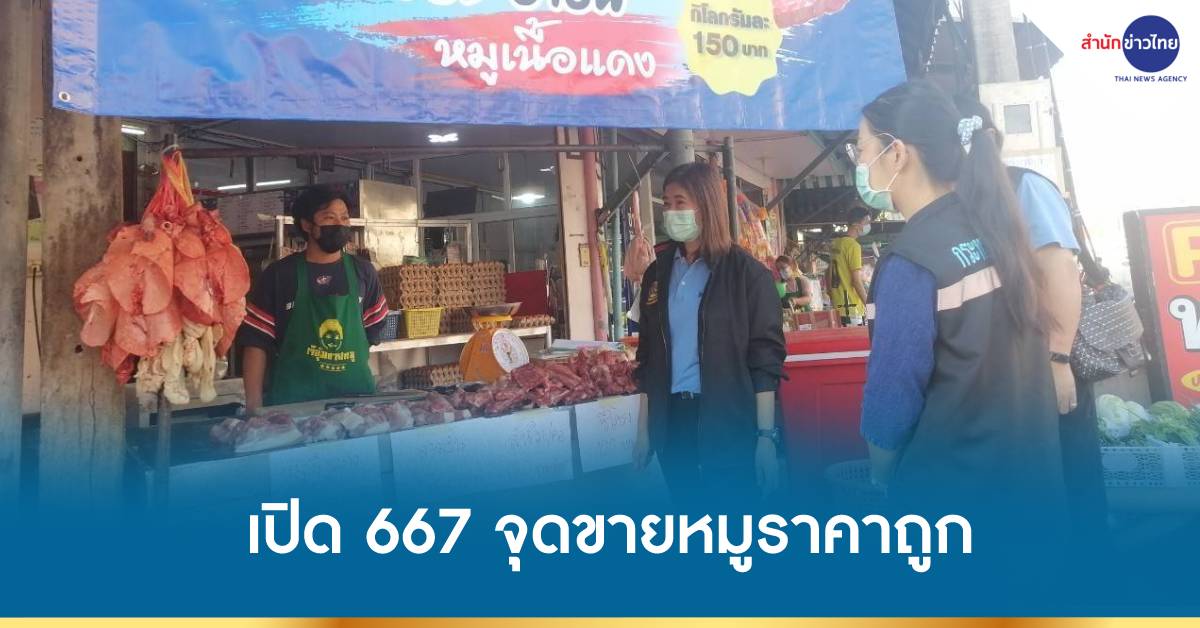 นนทบุรี 8 ม.ค.-พาณิชย์เปิด 667 จุดบริการขายหมูราคาถูกเพียง 150 บาทต่อกิโลกรัม ช่วยประชาชน เป็นมาตรการเสริมช่วงราคาหมูแพง พร้อมกำชับพาณิชย์ 76 จังหวัดตรวจตลาดให้ปิดป้ายแสดงราคาอย่าเอาเปรียบมากนัก หวั่นหากเปิดทางนำเข้าหมูต่างประเทศ กระทบผู้เลี้ยงรายย่อยมากขึ้น