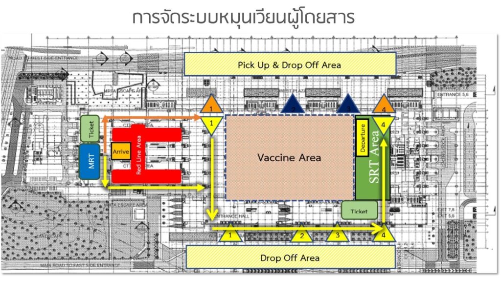 ได้อย่างสะดวก โดยมีจุดจำหน่ายตั๋วโดยสารไว้จำนวน 2 จุด ได้แก่ จุดจำหน่ายตั๋วสำหรับผู้โดยสารที่เดินทางมาจากรถไฟชานเมือง (สายสีแดง) และรถไฟฟ้าสายเฉลิมรัชมงคล (สายสีน้ำเงิน) ซึ่งอยู่บริเวณทิศใต้ของสถานีกลางบางซื่อ และจุดจำหน่ายตั๋วโดยสารสำหรับผู้โดยสารที่เดินทางมาจากจุดรับ-ส่ง (Drop Off) บริเวณประตูทางเข้า 4 ด้านหน้าของสถานีกลางบางซื่อ และผู้โดยสารขาเข้า (Arrive) (ลูกศรสีส้ม) สามารถใช้บันไดเลื่อนหรือลิฟต์โดยสารลงจากชั้นชานชาลา 5 และ 6 มาสู่บริเวณพื้นที่ชั้นจำหน่ายตั๋วโดยสาร (Ground Level) ซึ่งอยู่บริเวณทิศใต้ของสถานีกลางบางซื่อ โดยสามารถเชื่อมต่อการเดินทางเข้าสู่พื้นที่สำหรับผู้โดยสารที่ชำระค่าโดยสารแล้ว (Paid Area) ของรถไฟชานเมือง (สายสีแดง) หรือเชื่อมต่อไปยังรถไฟฟ้าสายเฉลิมรัชมงคล (สายสีน้ำเงิน) ได้อย่างสะดวกและสามารถใช้ประตูทางออกเพื่อไปจุดจอดรับ-ส่ง (Pick Up & Drop Off) บริเวณด้านหลังสถานี หรือไปสถานีชุมทางบางซื่อ จำนวน 2 ประตู ได้แก่ ประตูทางออก 1 และประตูทางออก 4 ทั้งนี้ ประตูทางออก 2 และ 3 เป็นทางเข้าออกสำหรับประชาชนผู้มารับบริการฉีดวัคซีนป้องกันเชื้อโควิด 19 เท่านั้น - ความพร้อมด้านขบวนรถ มีการการปรับปรุงห้องน้ำภายในขบวนรถ การลดมลพิษจากการเผาไหม้ของเครื่องยนต์ดีเซลที่มาจากหัวรถจักรโดยให้มีการทำเครื่องหมายกำหนดตำแหน่งจุดจอดของรถไฟให้ชัดเจน เพื่อให้พนักงานขับรถไฟจอดรถไฟตรงกับช่องดูดควันของสถานี เพื่อช่วยระบายควันจากการเผาไหม้ของเครื่องยนต์ได้อย่างมีประสิทธิภาพ