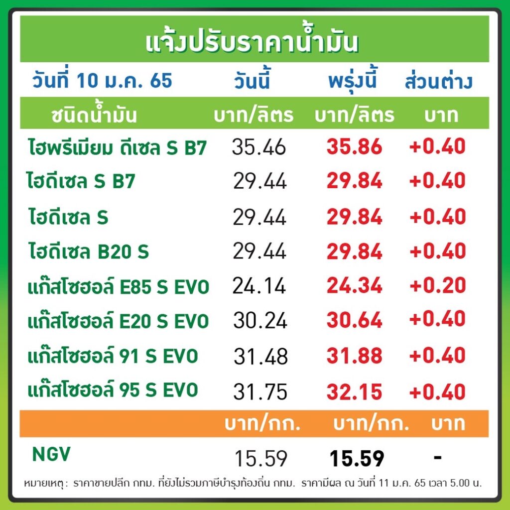 PTT Station ปรับราคาขายปลีกน้ำมันทุกชนิดขึ้น 40 สตางค์/ลิตร เว้น E85 ปรับขึ้น 20 สตางค์/ลิตร มีผลพรุ่งนี้ (11 ม.ค.65) เวลา 05.00 น. เป็นต้นไป โดยราคาขายปลีกจะเป็นดังนี้ ULG = 39.56, GSH95 = 32.15, E20 = 30.64, GSH91 = 31.88, E85 = 24.34, HSD- B7= 29.84, HSD-B10 = 29.84, HSD-B20=29.84,ดีเซลพรีเมี่ยม B7 = 35.86 บาทต่อลิตร โดยราคาขายปลีกข้างต้นยังไม่รวมภาษีบำรุงกรุงเทพมหานคร .-สำนักข่าวไทย