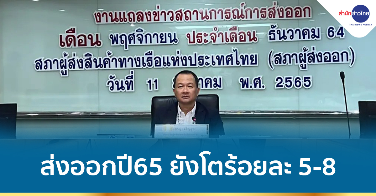 กรุงเทพฯ 11 ม.ค.-สภาผู้ส่งสินค้าทางเรือฯคาดส่งออกปี 2565 จะเติบโตได้ร้อยละ 5-8 แม้เผชิญสถานการณ์ระบาดของโควิดสายพันธุ์โอไมครอน และปัญหาขาดแคลนแรงงานและต้นทุนการจ้างงานที่ปรับขึ้น