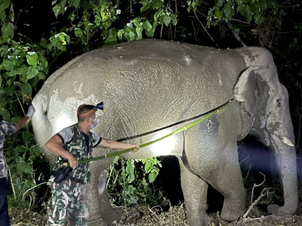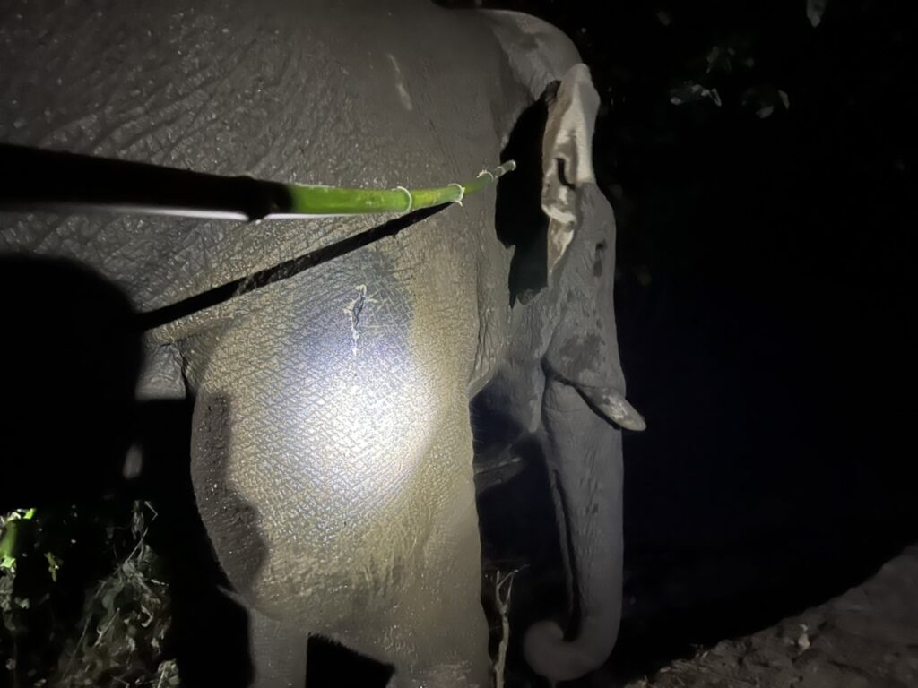 ต่อมาสัตวแพทย์ยิงลูกดอกยาซึมเพื่อควบคุมช้างป่า แล้วเข้าประเมินบาดแผลในระยะใกล้ โดยนำเครื่องตรวจโลหะสแกนบริเวณปากแผลและส่วนต่างๆ ของร่างกายซึ่งไม่พบสัญญาณการแจ้งเตือนโลหะ พบบาดแผลบริเวณต้นขาหน้าข้างขวา ลักษณะเป็นแผลเปิดขอบแผลไม่เรียบ ความยาวประมาณ 15 เซนติเมตร ไม่ลึกถึงกระดูก ไม่ใช่บาดแผลจากกระสุนปืน แต่เป็นแผลจากการสู้กันระหว่างช้างป่าด้วยกันโดยถูกงาแทง จึงล้างแผลและให้ยาลดอักเสบ จากนั้นให้ยาแก้ฤทธิ์ยาซึม เฝ้าดูอาการอย่างใกล้ชิดจนช้างฟื้นจากฤทธิ์ยาซึมดีแล้ว ใช้เวลาในการดำเนินการรักษา 1.30 ชั่วโมง