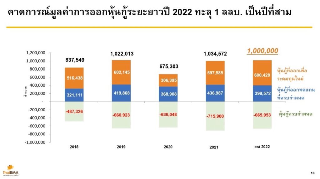 นายธาดา พฤฒิธาดา กรรมการผู้จัดการสมาคมตลาดตราสารหนี้ไทย (ThaiBMA) และนางสาวอริยา ติรณะประกิจ รองกรรมการผู้จัดการ สมาคมตลาดตราสารหนี้ไทย (ThaiBMA) แถลงสรุปภาวะตลาดตราสารหนี้ไทย ปี 2564 และแนวโน้มปี 2565 โดยในปี 2564 มูลค่าการออกหุ้นกู้ระยะยาวทะลุ 1 ล้านล้านบาทเป็นปีที่สอง โดยมียอดการออกที่ 1,034,572 ล้านบาท สูงขึ้นร้อยละ 50 จากปีก่อนหน้า เป็นการเพิ่มขึ้นจากทั้งกลุ่ม Investment grade และ High yield โดยหุ้นกู้ที่ออกในกลุ่ม High yield ส่วนใหญ่เป็นหุ้นกู้มีประกันที่กว่าร้อยละ 53 เป็นการค้ำประกันโดยนิติบุคคลอื่น