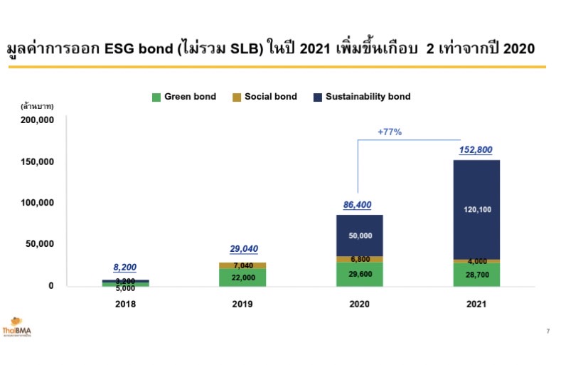 ด้านตราสารหนี้ มีการออกตราสารหนี้ประเภทใหม่ที่เรียกว่า ตราสารหนี้ส่งเสริมความยั่งยืน (Sustainability-linked Bond: SLB) ที่ผู้ออกจะกำหนดเป้าหมายด้านความยั่งยืนที่ต้องการบรรลุผลสำเร็จและเชื่อมโยงความสำเร็จกับการจ่ายอัตราดอกเบี้ย โดยในปีที่ผ่านมามีผู้ออก 2 ราย คือ บมจ.ไทยยูเนี่ยน กรุ๊ป มูลค่ารวม 11,000 ล้านบาท และ บมจ. อินโดรามา เวนเจอร์ส มูลค่ารวม 10,000 ล้านบาท