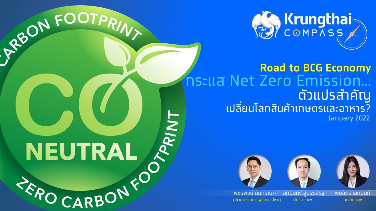 นายพชรพจน์ นันทรามาศ ผู้ช่วยกรรมการผู้จัดการใหญ่ ธนาคารกรุงไทย เปิดเผยว่า COVID-19 กลายเป็นตัวเร่ง สร้างแรงกระเพื่อมให้ทั่วโลก หันกลับมาให้ความสำคัญกับการขับเคลื่อนโมเดลเศรษฐกิจใหม่ เน้นความยั่งยืน (sustainability) ด้วยการลดการปล่อยก๊าซเรือนกระจกสุทธิเป็นศูนย์ (Net Zero Emission) ทำให้ภาคเกษตรและอาหาร ต้นตอสำคัญของก๊าซเรือนกระจกต้องเร่งปรับตัวเข้าสู่สังคมคาร์บอนต่ำ (Low Carbon Society) อย่างเลี่ยงไม่ได้ ขณะที่ผู้ประกอบการเกษตรและอาหารของไทย ยังไม่พร้อมรับมือเทรนด์นี้ จึงเข้าร่วมโครงการลดการปล่อยก๊าซเรือนกระจกค่อนข้างน้อย ผู้ส่งออกสินค้าเกษตรและอาหารไทยส่วนใหญ่เป็น SMEs ถึง 94% จึงมีข้อจำกัดในการปรับตัว