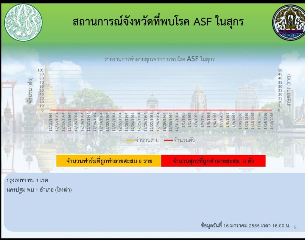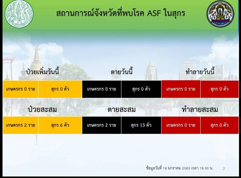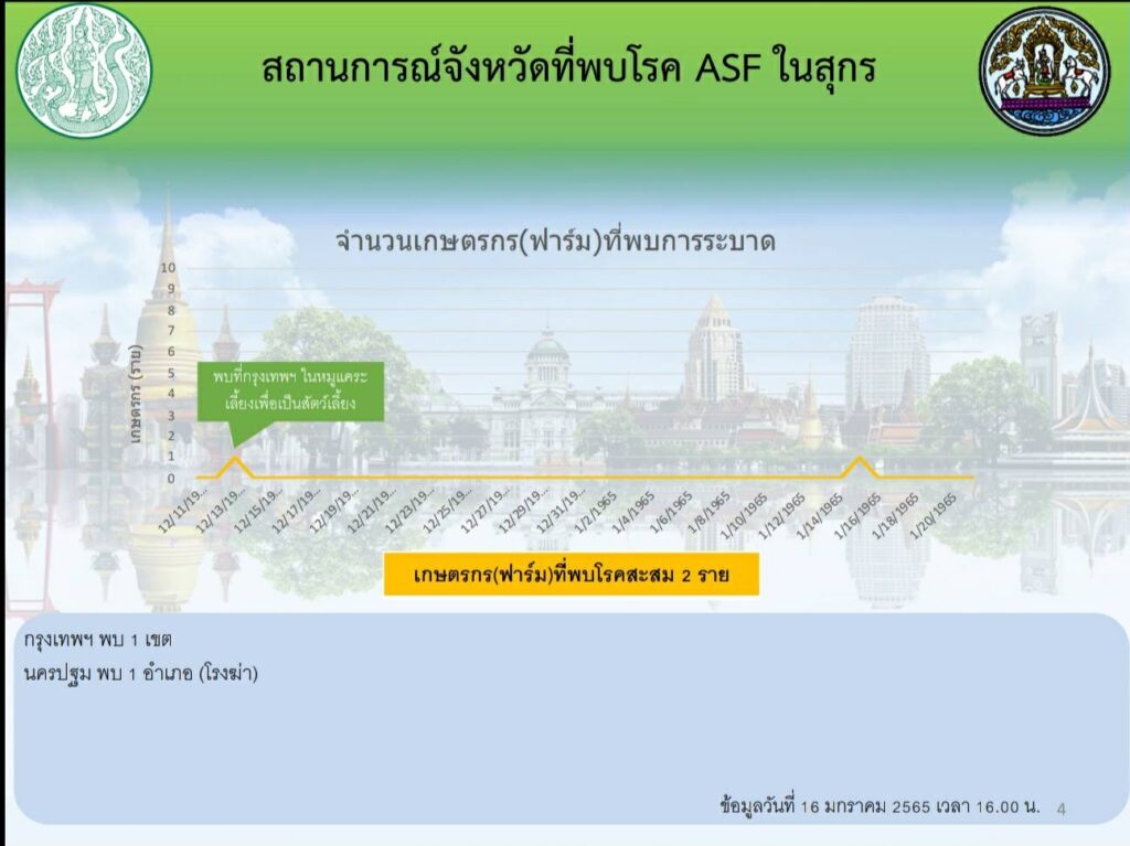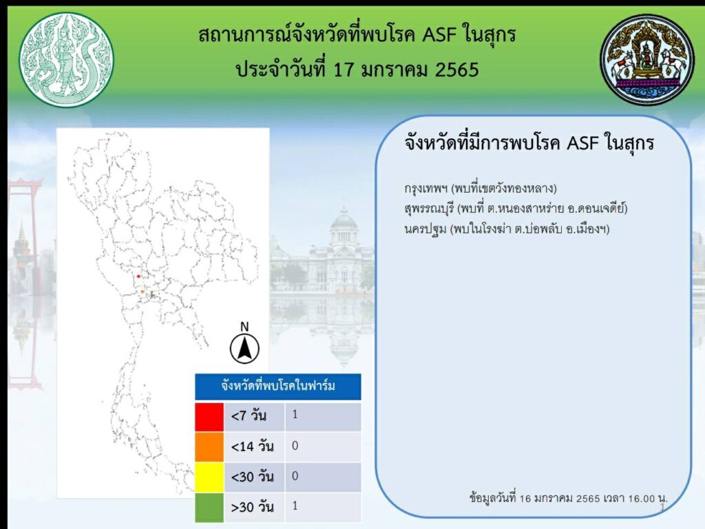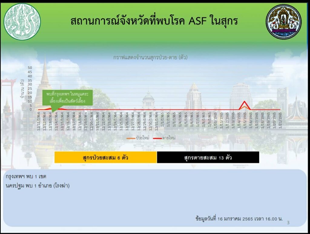 จากรายงานการพบโรค ASF ที่มายังห้องปฏิบัติการป้องกันและควบคุมโรค ASF ของกรมปศุสัตว์ถึงเช้าวันนี้ (17 ม.ค.) พบ 3 พื้นที่ โดยพบแห่งแรกที่โรงฆ่าในต. บ่อพลับ อ. เมือง จ. นครปฐมซึ่งเป็นที่มาของการประกาศพบโรคเมื่อวันที่ 11 ม.ค. ต่อมาพบอีก 2 พื้นที่คือ ที่เขตวังทองหลาง กรุงเทพฯ และที่ต. หนองสาหร่าย อ. ดอนเจดีย์ จ. สุพรรณบุรีโดยพบในฟาร์มของเกษตรกรรวม 2 ราย ขณะนี้มีสุกรป่วยรวม 6 ตัว ตาย 3 ตัว แต่ยังไม่มีการทำลายสุกร.-สำนักข่าวไทย