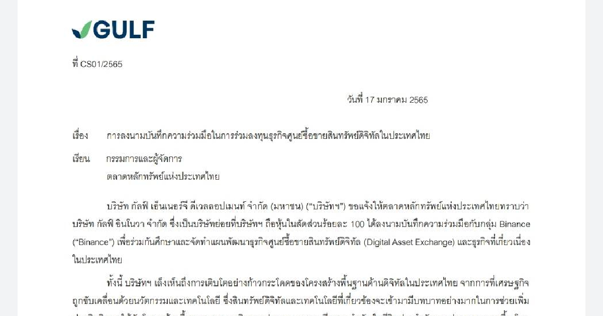 นางสาวยุพาพิน วังวิวัฒน์ ประธานเจ้าหน้าที่บริหารด้านการเงิน บริษัท กัลฟ์ เอ็นเนอร์จี ดีเวลลอปเมนท์ จำกัด (มหาชน) หรือ GULF แจ้งตลาดหลักทรัพย์แห่งประเทศไทยว่า บริษัท กัลฟ์ อินโนวา จำกัด ซึ่งเป็นบริษัทย่อยที่บริษัทฯ ถือหุ้นในสัดส่วนร้อยละ 100 ได้ลงนามบันทึกความร่วมมือกับกลุ่ม Binance (“Binance”) เพื่อร่วมกันศึกษาและจัดทำแผนพัฒนาธุรกิจศูนย์ซื้อขายสินทรัพย์ดิจิทัล (Digital Asset Exchange) และธุรกิจที่เกี่ยวเนื่อง ในประเทศไทย