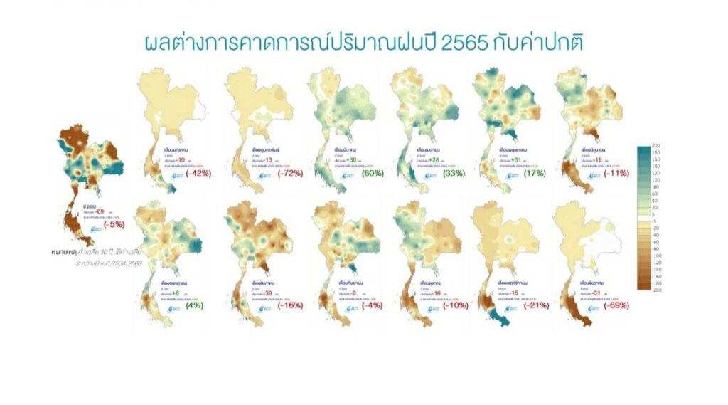ทั้งนี้ปี 2565 อาจเป็นปีที่มีฝนแปรปรวนเพราะสภาวะอุณหภูมิผิวน้ำทะเลมีแนวโน้มพลิกจากเย็นไปร้อน จากการวิเคราะห์อุณหภูมิผิวน้ำทะเลบริเวณมหาสมุทรแปซิฟิกตอนกลาง (ONI หรือ ENSO) มหาสมุทรแปซิฟิกตอนเหนือ (PDO) และมหาสมุทรอินเดีย (DMI) ซึ่งทั้ง 3 มหาสมุทรส่งผลต่อสภาพอากาศและฝนในประเทศไทย ล่าสุดคาดการณ์ว่า สถานการณ์ฝนปีนี้จะคล้ายคลึงกับปี 2552 โดยจะมีฝนตกเร็วจากพายุฤดูร้อนที่เกิดขึ้นบ่อยครั้งตั้งแต่เดือนมีนาคม-เมษายน ต่อเนื่องถึงต่อเนื่องเดือนพฤษภาคมที่เข้าสู่ฤดูฝนในเดือนพฤษภาคมจึงส่งผลให้ภัยแล้งของปี 2565 ไม่รุนแรงมากนัก ลักษณะเดียวกับปี 2564 ที่มีฝนตกมากกว่าปกติในช่วงเดือนเมษายน