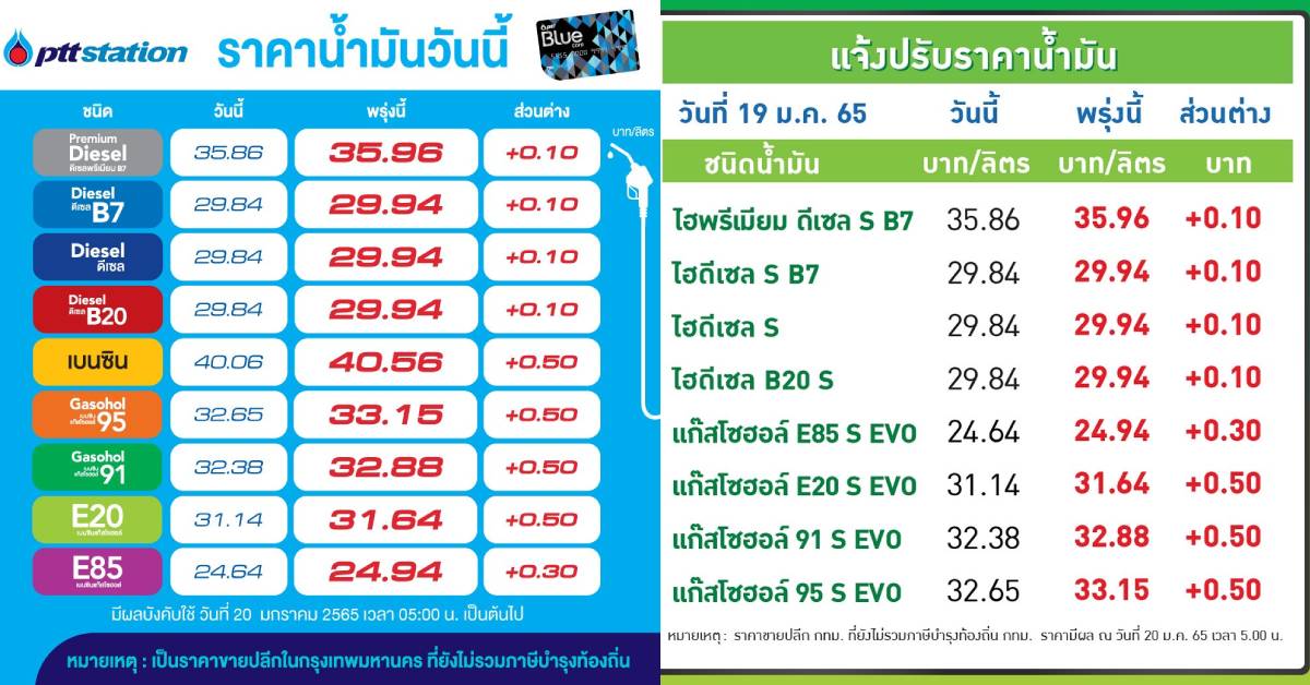 โดยราคาขายปลีก จะเป็นดังนี้ ULG = 40.56, GSH95 = 33.15, E20 = 31.64, GSH91 = 32.88, E85 = 24.94, HSD- B7= 29.94, HSD-B10 = 29.94, HSD-B20=29.94,ดีเซลพรีเมี่ยม B7 = 35.96 บาทต่อลิตร โดยราคาขายปลีกข้างต้นยังไม่รวมภาษีบำรุงกรุงเทพมหานคร.-สำนักข่าวไทย