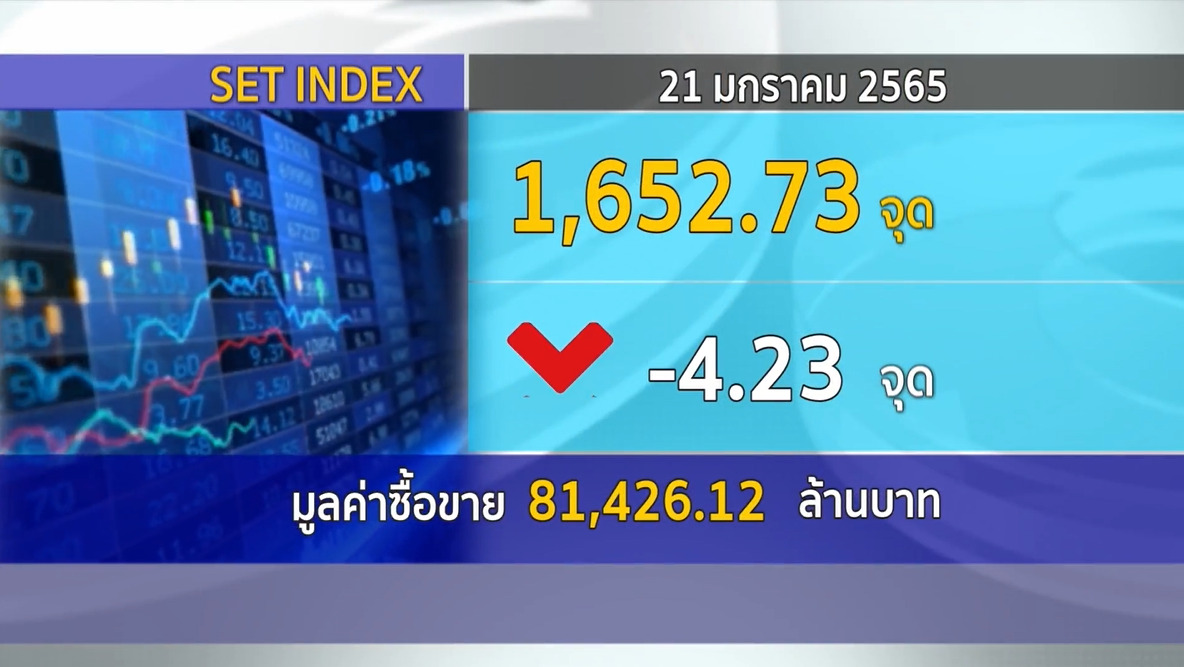 กทม. 21 ม.ค.-ตลาดหลักทรัพย์ ปิดวันนี้ที่ระดับ 1,652.73 จุด ลดลง 4.23 จุด (-0.26%) มูลค่าการซื้อขาย 81,426.12 ล้านบาท หุ้นไทยปรับตัวลงตามตลาดหุ้นต่างประเทศ หลัง Bond yield สหรัฐฯปรับตัวขึ้นอีกครั้ง กังวลเฟดจะเร่งการสิ้นสุด QE และขึ้นดอกเบี้ย