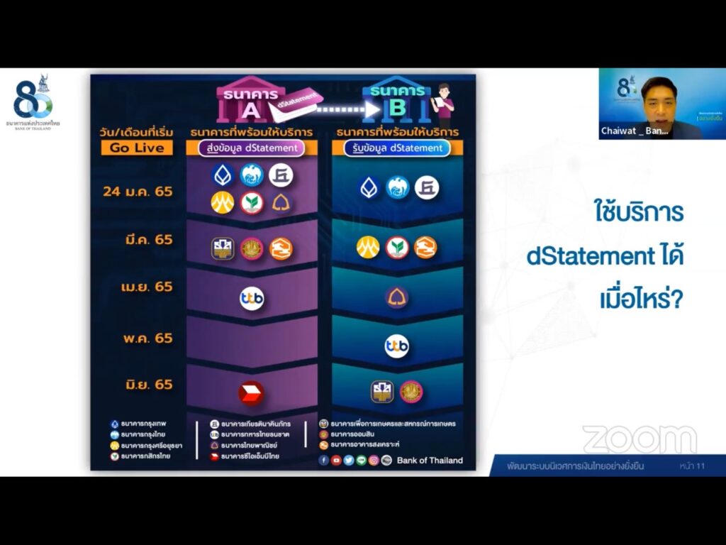 ธปท. สมาคมธนาคารไทย และสมาคมสถาบันการเงินของรัฐ ร่วมเปิดตัว บริการ dStatement (digital bank statement) ซึ่งเป็นการให้บริการรับส่งข้อมูลรายการเคลื่อนไหวบัญชีเงินฝาก (bank statement) ในรูปแบบดิจิทัลโดยตรงระหว่างสถาบันการเงิน ซึ่งจะช่วยให้ประชาชนที่ต้องการใช้ข้อมูล bank statement เป็นหลักฐานประกอบการสมัครขอใช้บริการทางการเงิน สามารถขอให้ธนาคารที่ตนเองมีบัญชีเงินฝากอยู่ ส่งข้อมูล bank statement ไปยังธนาคารแห่งอื่นได้โดยตรง ผ่านช่องทาง mobile banking application หรือช่องทางอื่นตามที่สถาบันการเงินแต่ละแห่งกำหนด ซึ่งจะทำให้ผู้ใช้บริการได้รับความสะดวกในการใช้บริการทางการเงินยิ่งขึ้น จากเดิมที่ต้องขอข้อมูลดังกล่าวในรูปเอกสารกระดาษ โดยในระยะแรกของการให้บริการ dStatement จะเริ่มใช้สำหรับการสมัครขอสินเชื่อผ่านช่องทางดิจิทัลและมีธนาคารที่เปิดให้บริการ dStatement ตั้งแต่วันที่ 24 มกราคม 2565 เป็นต้นไป จำนวน 6 ธนาคาร ประกอบด้วย ธ.กรุงเทพฯ ธ.กรุงไทยฯ ธ.กรุงศรีฯ ธ.กสิกรฯ ธ.ไทยพาณิชย์ฯ ธ.เกียตินาคินภัทร ฯและจะทยอยเปิดให้บริการเพิ่มเติมอีก 5 ธนาคาร ประกอบด้วย ธ.ออมสินฯ ธกส. ธอส. ธ.ทหารไทยฯ และธ.ซีไอเอ็มบีฯ ภายในช่วงครึ่งแรกของปี 2565