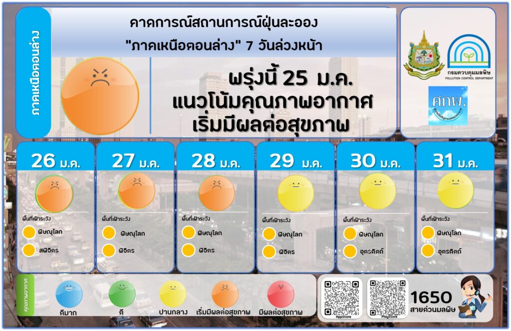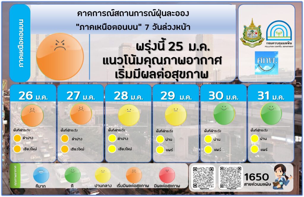 นายอรรถพล เจริญชันษา อธิบดีกรมควบคุมมลพิษและผู้อำนวยการศูนย์แก้ไขปัญหามลพิษทางอากาศ (ศกพ.) เปิดเผยว่า สถานการณ์ฝุ่น PM2.5 ในภาคเหนือ รวมถึงกรุงเทพฯ และปริมณฑลมีแนวโน้มสูงขึ้นเนื่องจากสภาพอากาศที่ปิดและลมอ่อน อยู่ในเกณฑ์เริ่มมีผลกระทบต่อสุขภาพโดยภาคเหนือตอนบนในจังหวัดลำปาง เชียงใหม่ น่าน และ แพร่จะมีแนวโน้มสูงขึ้น ระหว่างวันที่ 25-27 มกราคม ส่วนภาคเหนือตอนล่างในพื้นที่จังหวัดพิษณุโลกและพิจิตรมีแนวโน้มสูงขึ้นในวันที่ 25-28 มกราคม สำหรับกรุงเทพฯ และปริมณฑลมีแนวโน้มสูงขึ้นระหว่างวันที่ 25-26 มกราคม
