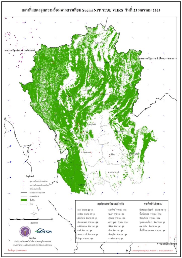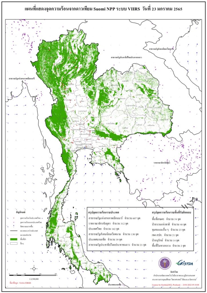 สำนักงานพัฒนาเทคโนโลยีอวกาศและภูมิสารสนเทศ (GISTDA) เผยข้อมูลจากดาวเทียมซูโอมิ เอ็นพีพี (Suomi NPP) ของระบบเวียร์ (VIIRS) เมื่อวานนี้ (23 ม.ค.) พบจุดความร้อนทั้งประเทศ 162 จุด เพิ่มขึ้นจากวันที่ 22 มกราคมถึง 111 จุด โดยพบมากสุดในพื้นที่เกษตร 54 จุด พื้นที่ป่าสงวนแห่งชาติ 48 จุด พื้นที่ชุมชนและอื่นๆ 23 จุด พื้นที่เขตสปก. 21 จุด พื้นที่ป่าอนุรักษ์ 14 จุด และพื้นที่ริมทางหลวง 2 จุด