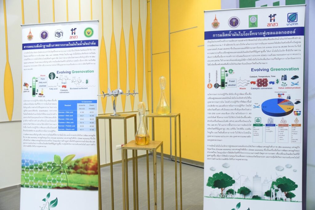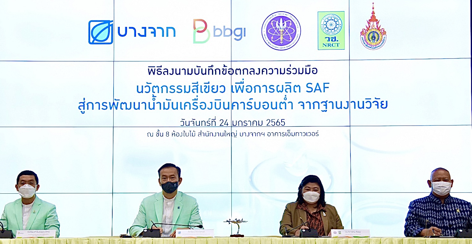 บริษัท บางจาก คอร์ปอเรชั่น จำกัด (มหาชน) บริษัท บีบีจีไอ จำกัด (มหาชน) สำนักงานการวิจัยแห่งชาติ (วช.) และมหาวิทยาลัยเทคโนโลยีราชมงคลอีสาน (มทร.อีสาน) ร่วมลงนามในบันทึกข้อตกลงความร่วมมือโครงการนวัตกรรมสีเขียวเพื่อทดลองผลิต Sustainable Aviation Fuel (SAF) หรือเชื้อเพลิงอากาศยานชีวภาพแบบยั่งยืนจากเอทานอล สู่การพัฒนาน้ำมันเครื่องบินคาร์บอนต่ำจากฐานงานวิจัย เพื่อนำองค์ความรู้ที่ได้จากโครงการวิจัย “การผลิตเชื้อเพลิงชีวภาพจากฟูเซลแอลกอฮอล์ที่ได้จากโรงงานเอทานอล” เมื่อปี พ.ศ. 2563 ดำเนินการโดย มทร. อีสาน ภายใต้การสนับสนุนการวิจัยโดย วช. ซึ่งจะช่วยเพิ่มมูลค่าของเอทานอลจากการเปลี่ยนเป็นแก๊สโซฮอล์ ต่อยอดเป็นผลิตภัณฑ์มูลค่าสูงในการผลิต SAF และช่วยส่งเสริมการพัฒนาเครือข่าย Supply Chain ของเชื้อเพลิงชีวภาพ