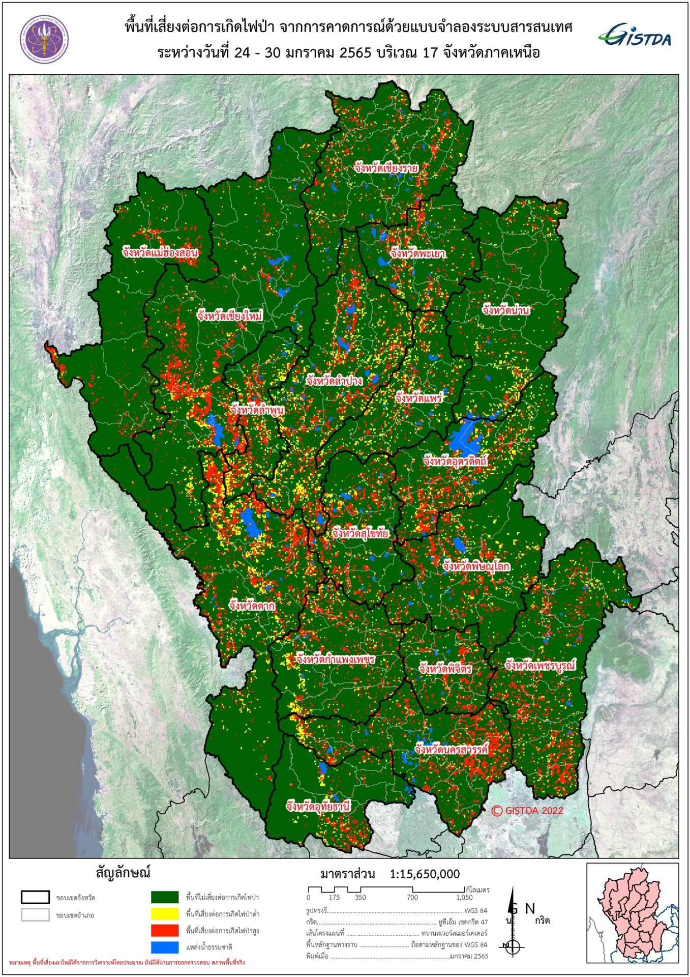 สำนักงานพัฒนาเทคโนโลยีอวกาศและภูมิสารสนเทศ (องค์การมหาชน) หรือ GISTDA เปิดเผยข้อมูลจากภาพจากดาวเทียมระบบ MODIS แสดงให้เห็นว่า 17 จังหวัดภาคเหนือซึ่งเป็นพื้นที่เสี่ยงต่อการเกิดไฟป่านั้น มี 3 จังหวัดมีความเสี่ยงสูงต่อการเกิดไฟป่าได้แก่ ตาก ลำปาง และเชียงใหม่ ตามลำดับ ส่วนอีก 14 จังหวัดที่เหลือยังคงมีตัวเลขคาดการณ์พื้นที่เสี่ยงเพิ่มขึ้นจากสัปดาห์ก่อนหน้า สาเหตุเกิดจากการเผาเพื่อเตรียมพื้นที่เพาะปลูกหรือเผาเพื่อหาของป่าแล้วลุกลามสู่ป่าสงวนแห่งชาติและป่าอนุรักษ์ โดยเตือนให้เฝ้าระวังจนถึงวันที่ 30 มกราคม 2565