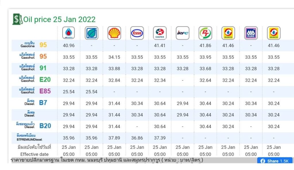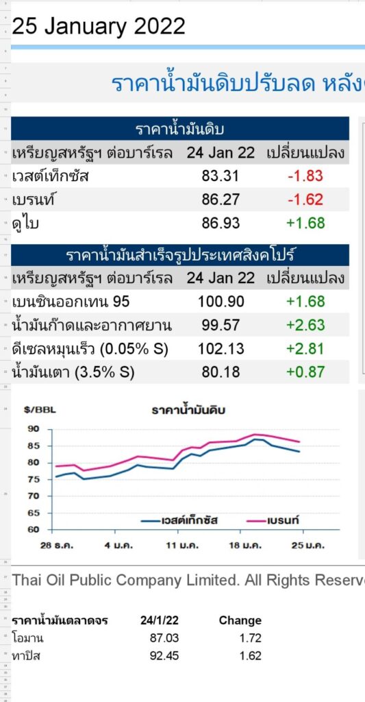 ผุ้สื่อข่าว รายงานว่า ราคาน้ำมันของไทย วันที่ 25 ม.ค.65 ในส่วน ของปั๊มพีทีทีสเตชั่น และบางจากฯ ขึ้นเฉพาะ กลุ่มเบนซิน โดย เบนซิน, แก๊สโซฮอล์อี10 ขึ้น 40 สต. ส่วนอี85 และอี20 ขึ้น 60 สตางค์ ส่วนดีเซล บางจากฯ , บริษัท ปตท.น้ำมันและการค้าปลีก จำกัด (มหาชน) หรือโออาร์ และ บมจ.ไออาร์พีซี …ไม่ขยับขึ้นราคา ช่วยตรึงราคาไม่เกิน 30 บาทต่อลิตร ตามนโยบายของรัฐบาล เนื่องจาก 3 ราย มีผู้ถือหุ้นใหญ่ คือ รัฐบาล แต่รายอื่นๆ ขยับดีเซลขึ้นไปแล้วราคาระหว่าง 30.24- 31.44 บาท/ลิตร เนื่องจากหากตรึงราคาก็จะไม่มีกำไร