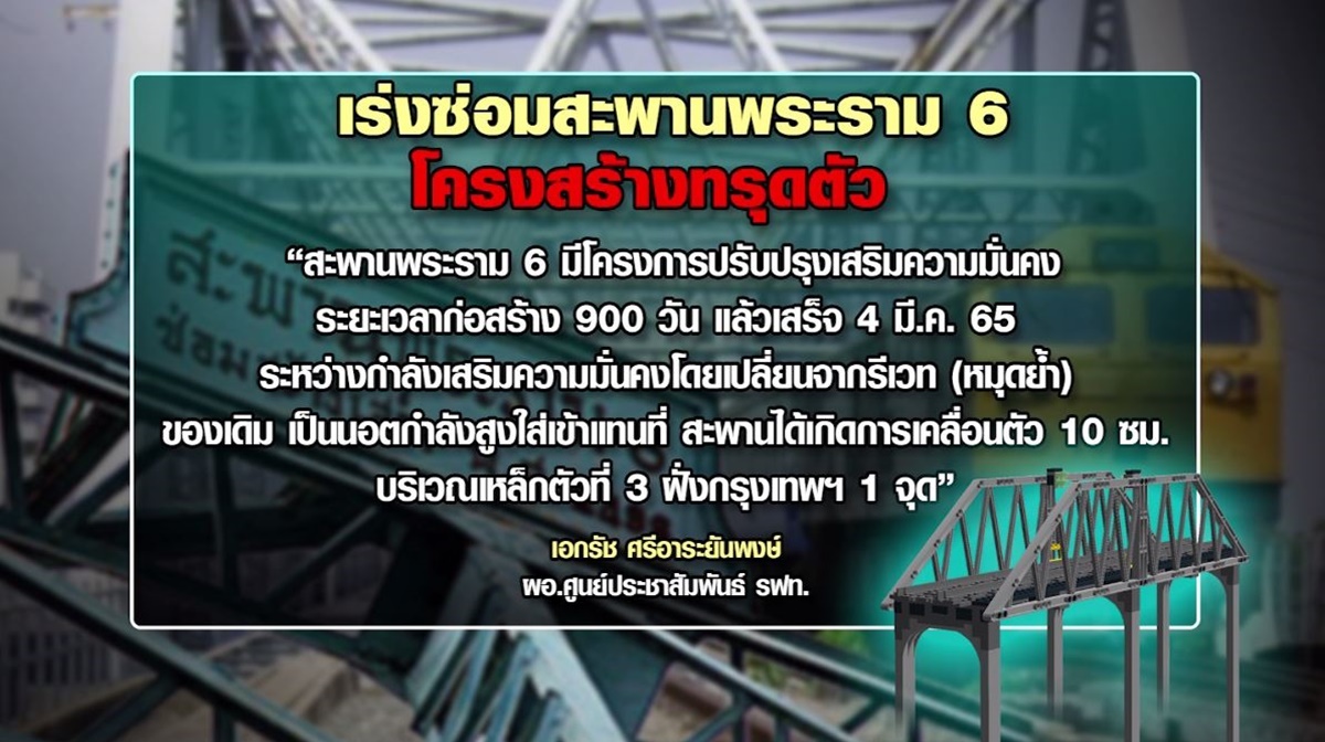 กรุงเทพฯ 25 ม.ค. – การรถไฟฯ เร่งซ่อมแซมสะพานพระราม 6 หลังโครงสร้างกลางสะพานทรุดตัว ส่งผลต้องหยุดเดินรถ ตั้งแต่เมื่อวานนี้ (24 ม.ค.) ที่เป็นวันเกิดเหตุ และวันนี้ต่อเนื่องเป็นวันที่ 2 คาดพรุ่งนี้ (26 ม.ค.) จะกลับมาเดินรถได้ตามปกติ. – สำนักข่าวไทย