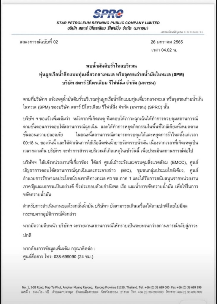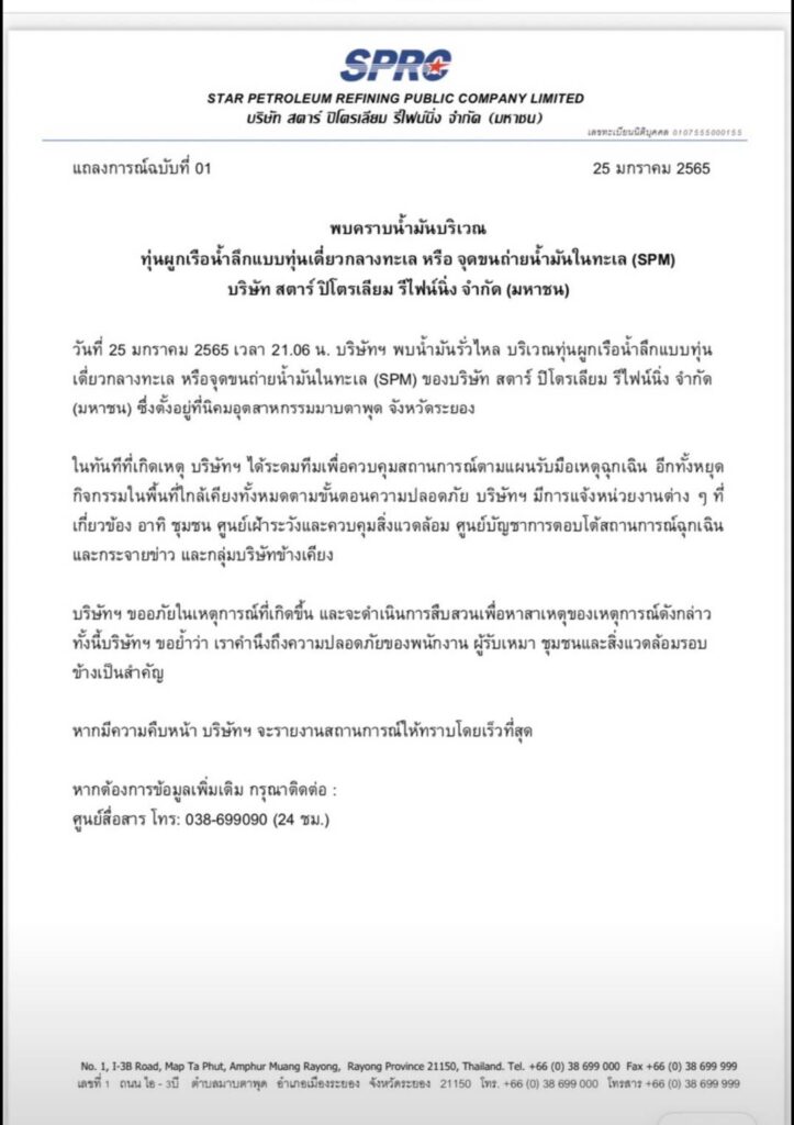 บริษัท สตาร์ ปิโตรเลียม รีไฟนนิ่ง จำกัด (มหาชน) ออกแถลงการณ์ 2 ฉบับ โดยฉบับที่ 1 ออกเมื่อเวลา 21.06 น. เมื่อวานนี้ (25 ม.ค.) ระบุวว่า บริษัทพบน้ำมันรั่วไหลบริเวณทุ่นผูกเรือน้ำลึกแบบทุ่นเดี่ยวกลางทะเลหรือจุดขนถ่ายน้ำมันในทะเล (SPM) ซึ่งตั้งอยู่ที่นิคมอุตสาหกรรมมาบตาพุด จังหวัดระยอง โดยทันทีที่เกิดเหตุระดมทีมเพื่อควบคุมสถานการณ์ตามแผนรับมือเหตุฉุกเฉิน อีกทั้งหยุดกิจกรรมในพื้นที่ใกล้เคียงทั้งหมดตามขั้นตอนความปลอดภัย แจ้งหน่วยงานต่างๆ ที่เกี่ยวข้องได้แก่ ชุมชน ศูนย์เฝ้าระวังและควบคุมสิ่งแวดล้อม ศูนย์บัญชาการตอบโด้สถานการณ์ฉุกเฉินและกระจายข่าว และกลุ่มบริษัทข้างเคียง