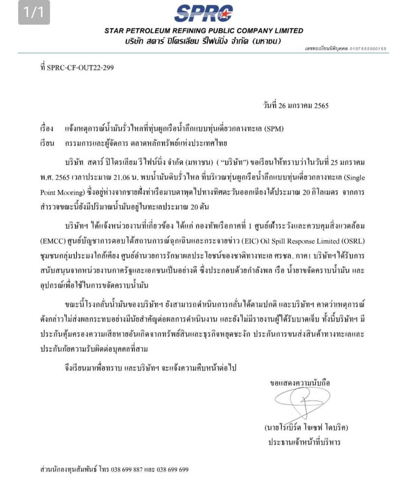 นายสมภพ พัฒนอริยางกูล โฆษกกระทรวงพลังงาน เปิดเผยว่า จากสถานการณ์การรั่วไหลของน้ำมันดิบจากท่อใต้ทะเลของบริษัท สตาร์ ปิโตรเลียม รีไฟน์นิ่ง จำกัด (มหาชน) หรือSPRCเมื่อช่วงเวลาประมาณ 21.00 น. ของวันที่ 25 มกราคม 2565 ณ บริเวณทุ่นผูกเรือน้ำลึกแบบเดี่ยว (SPM:(Single
