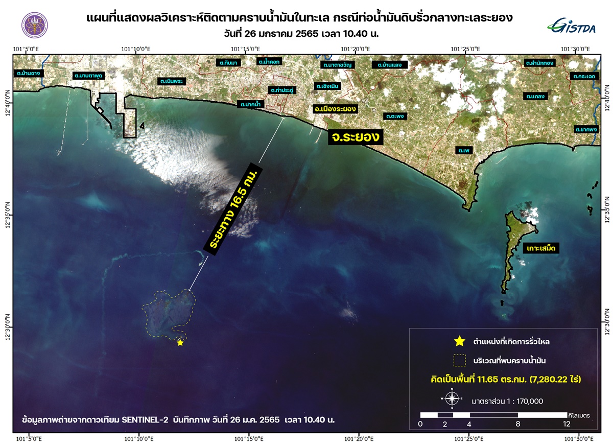 สำนักงานพัฒนาเทคโนโลยีอวกาศและภูมิสารสนเทศ (องค์การมหาชน) เผยภาพถ่ายดาวเทียมที่บันทึกพื้นที่ที่เกิดเหตุน้ำมันดิบรั่วไหล บริเวณทุ่นผูกเรือน้ำลึกแบบทุ่นเดี่ยวกลางทะเล หรือจุดขนถ่ายน้ำมันในทะเล ซึ่งอยู่ห่างจากชายฝั่งท่าเรือมาบตาพุดไปทางทิศตะวันออกเฉียงใต้ ประมาณ 20 กิโลเมตร เมื่อเวลา 21.06 น. ของวันที่ 25 มกราคม 2565 โดยภาพจากดาวเทียม Sentinel-2 ของวันที่ 26 มกราคม 2565 เวลา 10.40 น. พบคราบน้ำมันลอยเป็นกลุ่มก้อนกลางอ่าวมาบตาพุด (กรอบสีเหลือง) คิดเป็นพื้นที่ 11.65 ตารางกิโลเมตร หรือ 7,280 ไร่ ซึ่งคิดเป็นกว่า 2 เท่าของเกาะเสม็ด