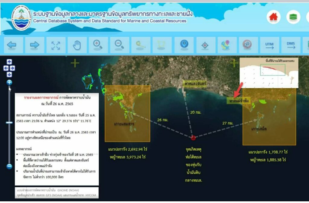 จากการใช้โปรแกรม OIL MAP ซึ่งเป็นแบบจำลองคณิตศาสตร์ที่ใช้ทำนายการเคลื่อนตัวและการเปลี่ยนแปลงสภาพของคราบน้ำมันที่รั่วไหลในทะเลและน้ำจืด โดยอาศัยข้อมูลปริมาณน้ำมัน สภาพทางภูมิศาสตร์ ความเร็วและทิศทางของกระแสลม และน้ำทะเล ล่าสุดพบว่า กลุ่มน้ำมันที่รั่วไหลออกมาอาจเคลื่อนตัวเข้าสู่ชายฝั่งทะเลบริเวณนิคมอุตสาหกรรมมาบตาพุด