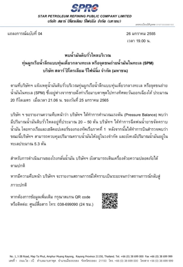 ส่วนบริษัท สตาร์ ปิโตรเลียม รีไฟน์นิ่ง จำกัด (มหาชน) ออกแถลงการณ์ฉบับที่ 4 เมื่อค่ำวานนี้ รายงานความคืบหน้าว่า จากการคำนวณแรงดัน (Pressure Balance) พบว่า น้ำมันดิบรั่วไหลประมาณ 20 – 50 ตัน บริษัทฉีดพ่นน้ำยาขจัดคราบน้ำมันโดยทางเรือ ทางกองทัพเรือภาคที่ 1 ส่งเฮลิคอปเตอร์บินสำรวจพบว่า สามารถควบคุมปริมาณคราบน้ำมันให้อยู่ในวงจำกัด โดยยังคงมีปริมาณน้ำมันอยู่ในทะเลประมาณ 5.3 ตัน .-สำนักข่าวไทย