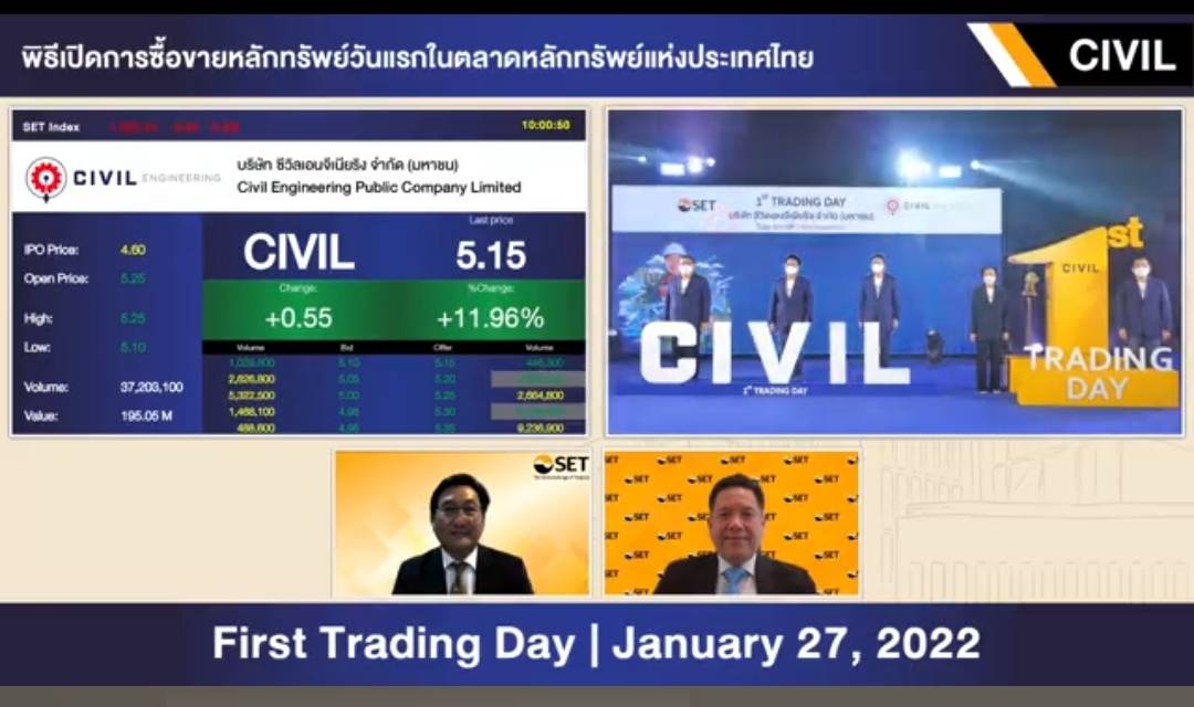 CIVIL เปิดเทรดวันแรกในตลาดหลักทรัพย์ฯที่ 5.25บาท สูงIPOกว่า 14.13% หรือ 0.65 บาท จากราคา IPO ที่อยู่ 4.60 บาทมีมูลค่าหลักทรัพย์ ณ ราคา IPO 3,220 ล้านบาทอยู่ ในกลุ่มอสังหาริมทรัพย์และก่อสร้าง หมวดบริการรับเหมาก่อสร้าง ประกอบธุรกิจ 3 ประเภท ได้แก่ 1) ธุรกิจรับเหมาก่อสร้างโครงการในแนวราบ 2) ธุรกิจจำหน่ายชิ้นส่วนคอนกรีตสำเร็จรูปและวัสดุก่อสร้างประเภทอื่นๆ เพื่อสนับสนุนงานก่อสร้างของกลุ่มบริษัท 3) ธุรกิจให้เช่าอาคารและเครื่องจักรอุปกรณ์ที่ใช้ในการก่อสร้าง โดยบริษัทดำเนินธุรกิจรับเหมาก่อสร้างมาอย่างยาวนาน และมีความชำนาญในงานโครงการแนวราบ ได้แก่ งานทาง ทางรถไฟ ท่าอากาศยาน เขื่อนและอ่างเก็บน้ำ กลุ่มลูกค้าหลักได้แก่หน่วยงานรัฐและภาคเอกชนที่มีศักยภาพ โดย ณ 30 พฤศจิกายน 2564 บริษัทมีงานที่อยู่ระหว่างส่งมอบ 16,813 ล้านบาท ซึ่งจะทยอยรับรู้รายได้ไปจนถึงปี 2567