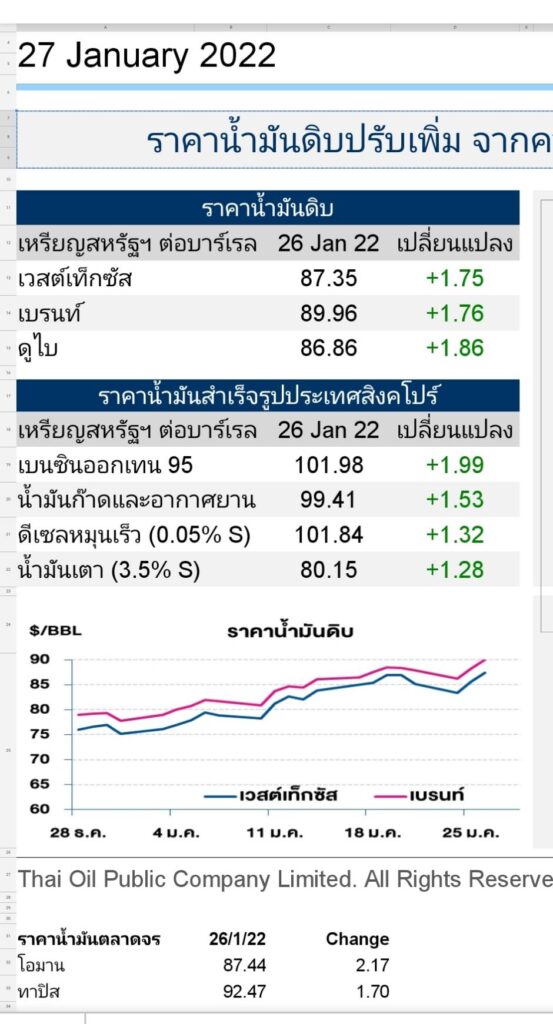 ทั้งนี้น้ำมันดิบ WTI เพิ่มขึ้น 1.75 ดอลลาร์ ปิดที่ 87.35 ดอลลาร์/บาร์เรล, น้ำมันดิบเบรนท์ (BRENT) เพิ่มขึ้น 1.76 ดอลลาร์ ปิดที่ 89.96 ดอลลาร์/บาร์เรลในระหว่างวัน สัญญาน้ำมันดิบเบรนท์พุ่งขึ้นทะลุ 90 ดอลลาร์/บาร์เรลเป็นครั้งแรกในรอบ 8 ปี ส่วนราคาน้ำมันสำเร็จรูปสิงคโปร์ทั้งดีเซล/เบนซินสูงกว่า100ดอลลาร์/บาร์เรล