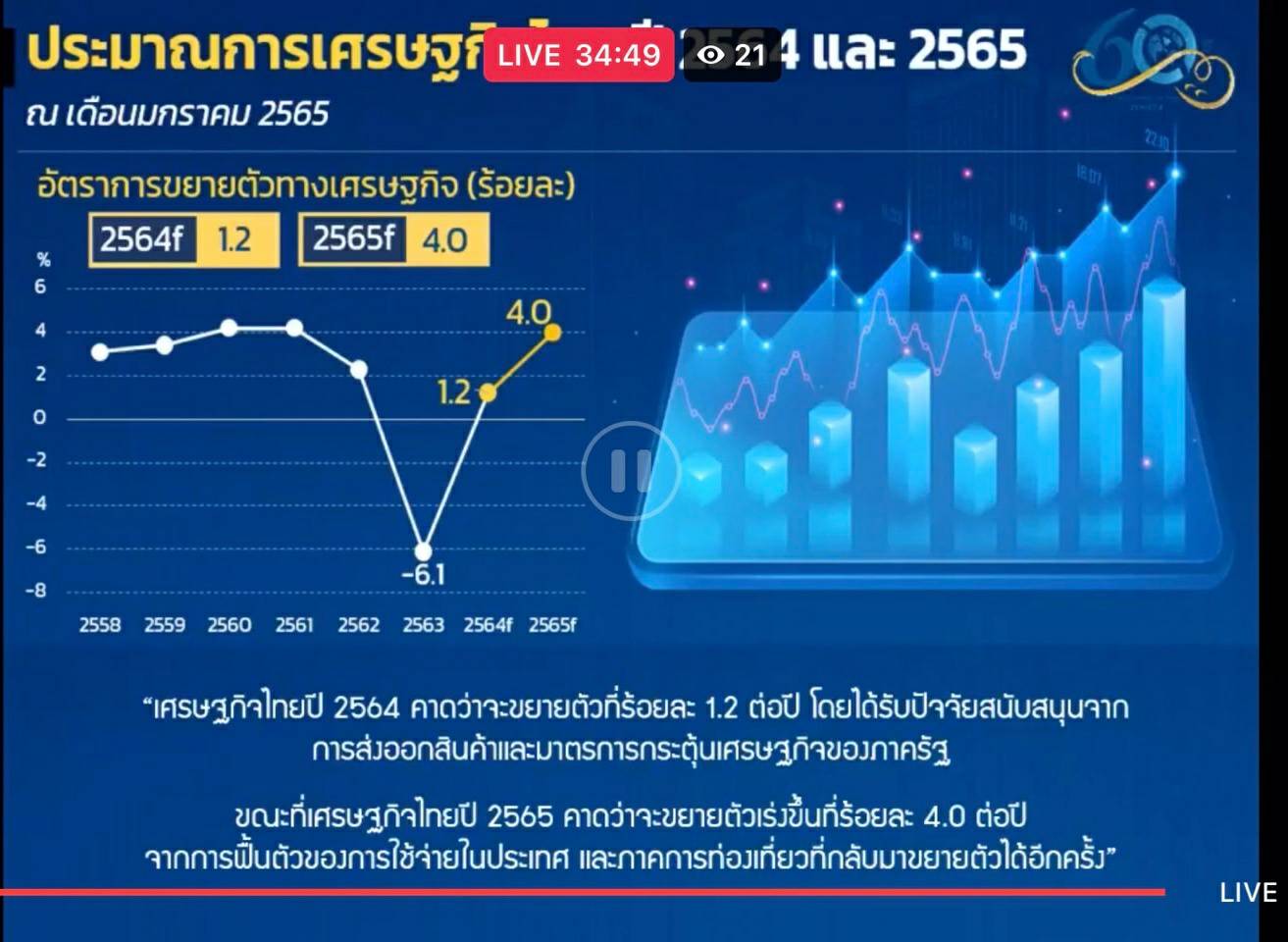 กรุงเทพฯ 28 ม.ค. -เศรษฐกิจไทยปี 2564 คาดว่า จะขยายตัวที่ร้อยละ 1.2 ต่อปี โดยได้รับปัจจัยสนับสนุนจากการส่งออกสินค้าและมาตรการกระตุ้นเศรษฐกิจของภาครัฐ ขณะที่เศรษฐกิจไทยปี 2565 คาดว่า จะขยายตัวเร่งขึ้นที่ร้อยละ 4.0 ต่อปี จากการฟื้นตัวของการใช้จ่ายในประเทศและภาคการท่องเที่ยวที่กลับมาขยายตัวได้อีกครั้ง
