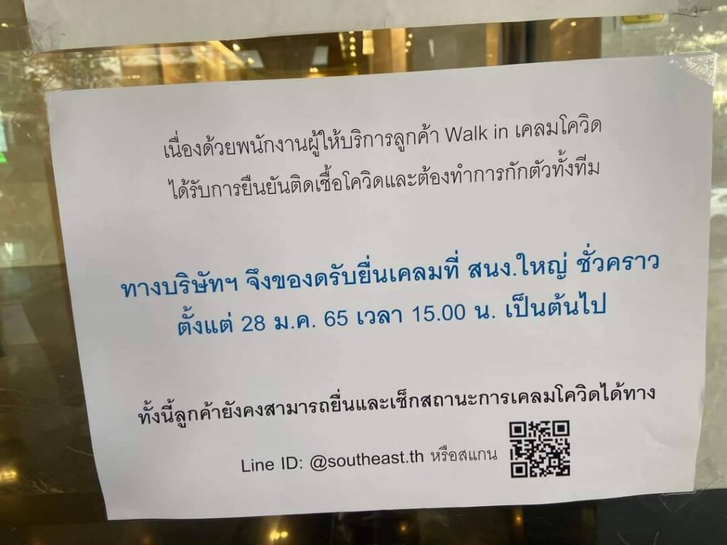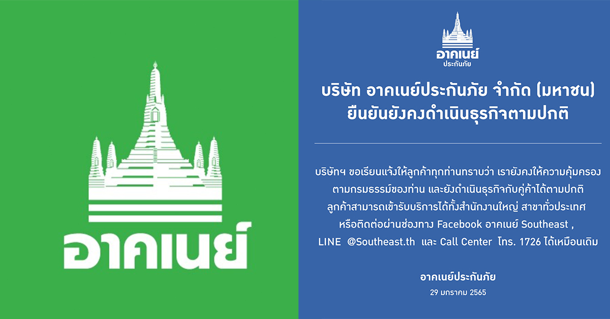 ผู้สื่อข่าวรายงาน ว่า ในเช้าวันนี้ได้มีลูกค้าของ บริษัท อาคเนย์ประกันภัย จำกัด (มหาชน) ได้เดินทางไปสำนักงานใหญ่ เพื่อติดต่อเคลมประกันฯ และอื่น อย่างไรก็ตาม ไม่สามาถเข้า สำนักงานได้ เจ้าหน้าที่ไม่รับเรื่องมีการติดประกาศด้านหน้าว่า พนักงานให้บริการระบบวอล์กอิน เคลมประกันติดโควิดและต้องกักตัวทั้งทีม ทางบริษัทจึงขอรับยื่นเคลมที่สำนักงานใหญ่เป็ฯการชั่วคราว และ ขอให้ลูกค้าสามารถยื่นและเช็กสถานะเคลมประกันโควิด ทางไอดีไลน์ : @Southeast.th