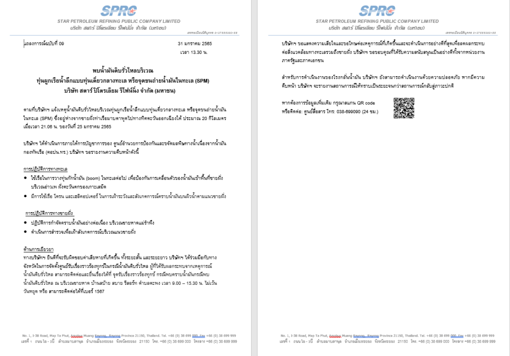 บริษัท สตาร์ ปิโตรเลียม รีไฟน์นิ่ง จำกัด (มหาชน) ออกแถลงการณ์ฉบับที่ 9 ระบุถึงการปฏิบัติการทางทะเล โดยใช้เรือในการวางทุ่นกักน้ำมัน (boom) ในทะเลเพื่อป้องกันการเคลื่อนตัวของน้ำมันเข้าพื้นที่ชายฝั่งบริเวณอ่าวเพ ฝั่งตะวันตกของเกาะเสม็ด ใช้เรือ โดรน และเฮลิคอปเตอร์ ในการเฝ้าระวังและสังเกตการณ์คราบน้ำมันบนผิวน้ำตามแนวชายฝั่ง