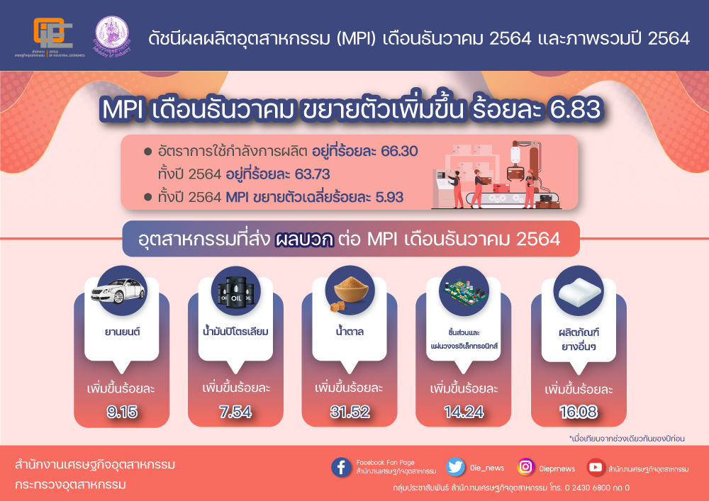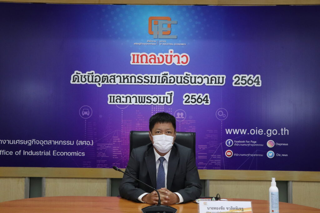 นายทองชัย ชวลิตพิเชฐ ผู้อำนวยการสำนักงานเศรษฐกิจอุตสาหกรรม (สศอ.) กล่าวว่า ดัชนีผลผลิตอุตสาหกรรมเดือนธันวาคมปี 2564 อยู่ที่ระดับ 102.59 ขยายตัวเพิ่มขึ้นจากช่วงเดียวกันของปีก่อนที่ร้อยละ 6.83 และขยายตัวสูงขึ้นกว่าเดือนธันวาคมปี 2562 ที่อยู่ในระดับ 98.81 ซึ่งเป็นช่วงก่อนเกิดการแพร่ระบาดของโรคโควิด-19 ส่งผลให้ดัชนีผลผลิตอุตสาหกรรม (MPI) ทั้งปี 2564 ขยายตัวเพิ่มขึ้นจากช่วงเดียวกันของปีก่อนที่ร้อยละ 5.93 ในขณะที่อัตราการใช้กำลังการผลิตทั้งปี 2564 อยู่ที่ร้อยละ 63.73 ส่งสัญญาณเศรษฐกิจภาคอุตสาหกรรมกลับมาขยายตัวและมีแนวโน้มจะขยายตัวเพิ่มขึ้นในปี 2565