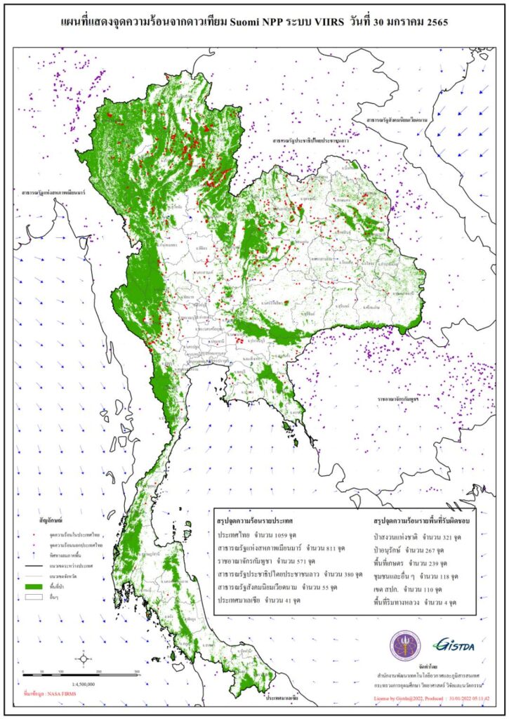 สำนักงานพัฒนาเทคโนโลยีอวกาศและภูมิสารสนเทศ (GISTDA) รายงานข้อมูลจากดาวเทียมซูโอมิ เอ็นพีพี (Suomi NPP) ของระบบเวียร์ (VIIRS) วันที่ 30 มกราคม 2565 พบจุดความร้อนทั้งประเทศ 1,059 จุด เพิ่มขึ้นจากวันก่อนหน้า 98 จุด โดยพบมากสุดในพื้นที่ป่าสงวนแห่งชาติ 321 จุด พื้นที่ป่าอนุรักษ์ 267 จุด พื้นที่เกษตร 239 จุด พื้นที่ชุมชนและอื่นๆ 118 จุด พื้นที่เขตสปก. 110 จุด และพื้นที่ริมทางหลวง 4 จุด ส่วนจังหวัดที่พบจุดความร้อนมากสุด 3 อันดับแรกคือ อุตรดิตถ์ 95 จุด ลำปาง 92 จุด และกาญจนบุรี 79 จุด