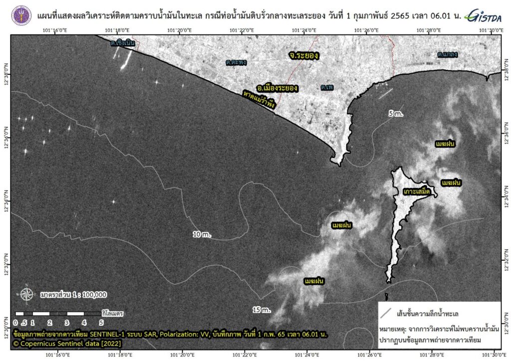 สำนักงานพัฒนาเทคโนโลยีอวกาศและภูมิสารสนเทศ (องค์การมหาชน) หรือ GISTDA ใช้ภาพถ่ายจากดาวเทียม SENTINEL-1 ซึ่งเป็นดาวเทียมระบบเรดาร์ บันทึกภาพวันที่ 1 กุมภาพันธ์ 2565 เมื่อเวลา 06.01 น. สำรวจคราบน้ำมันในท้องทะเล ซึ่งล่าสุดไม่พบคราบน้ำมันลอยในทะเล รวมถึงพื้นที่เฝ้าระวังในอุทยานแห่งชาติเขาแหลมหญ้า-หมู่เกาะเสม็ด