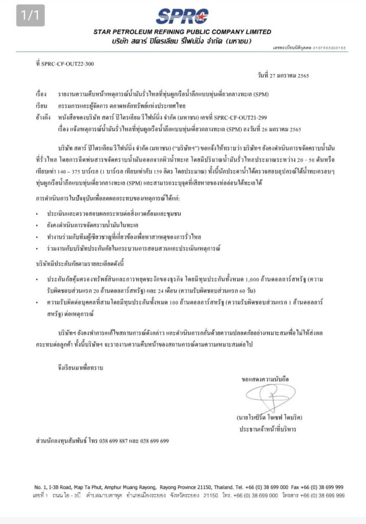 นายโรเบิร์ต โจเซฟ โดบริค ประธานเจ้าหน้าที่บริหาร บริษัท สตาร์ ปิโตรเลียม รีไฟน์นิ่ง จำกัด (มหาชน) หรือ SPRC ทำหนังสือรายงานความคืบหน้าเหตุการณ์น้ำมันรั่วไหลที่ทุ่นผูกเรือน้ำลึกแบบทุ่นเดี่ยวกลางทะเล (SPM) ต่อกรรมการและผู้จัดการตลาดหลักทรัพย์แห่งประเทศไทย เมื่อวันที่ 27 มกราคม 2565 โดยระบุว่า มีปริมาณน้ำมันรั่วไหลประมาณระหว่าง 20-50 ตัน หรือเทียบเท่า 140-375 บาร์เรล ทั้งนี้ นักประดาน้ำได้ตรวจสอบอุปกรณ์ใต้น้ำทะเล และสามารถระบุจุดที่เสียหายของท่ออ่อนใต้ทะเลได้