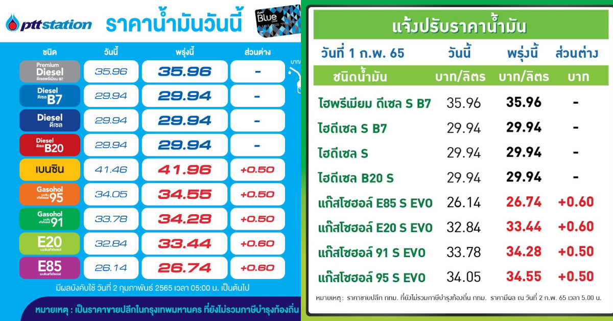 กรุงเทพฯ 1 ก.พ.- PTT Station – บางจากฯ ปรับราคาขายปลีกน้ำมันเบนซินและแก๊สโซฮอล์ทุกชนิดขึ้น 50 สตางค์ต่อลิตร เว้น E20 และ E85 ปรับขึ้น 60 สตางค์ต่อลิตร ส่วนกลุ่มดีเซลทุกชนิด คงเดิม มีผล 2 ก.พ.65 เวลา 05.00 น. เป็นต้นไป
