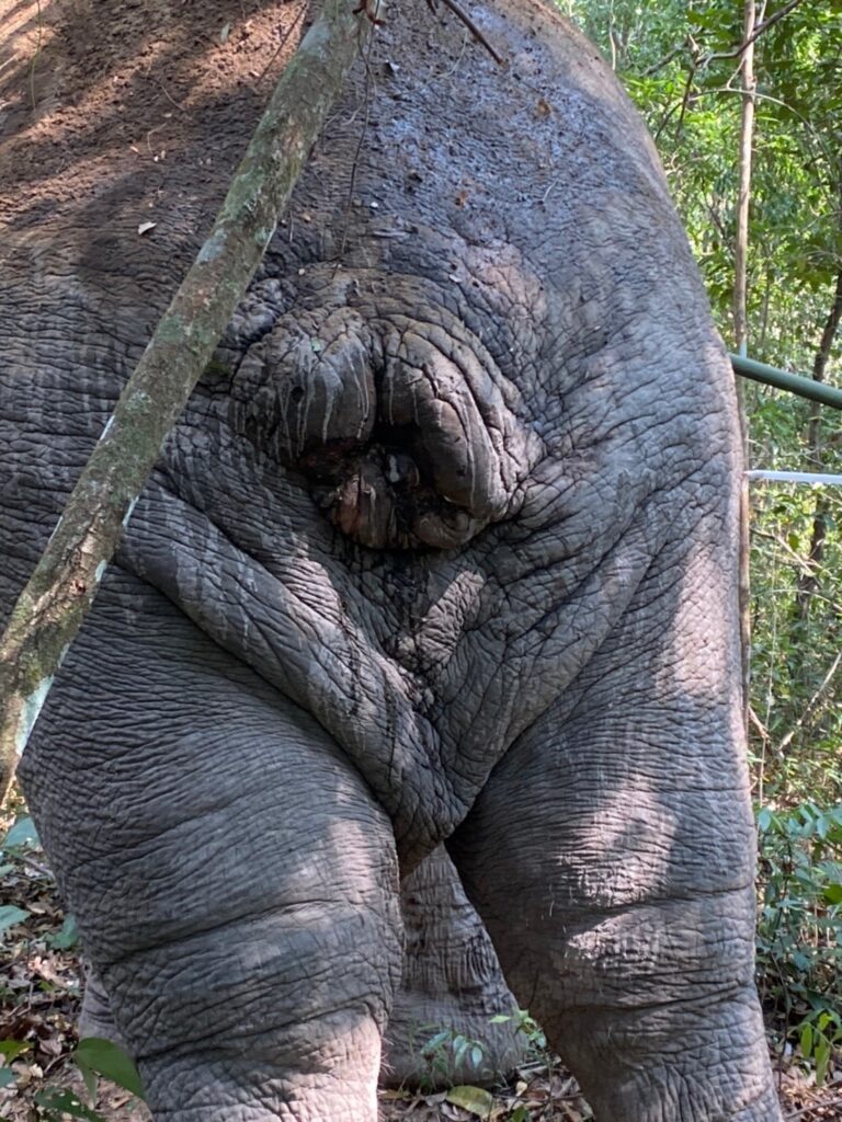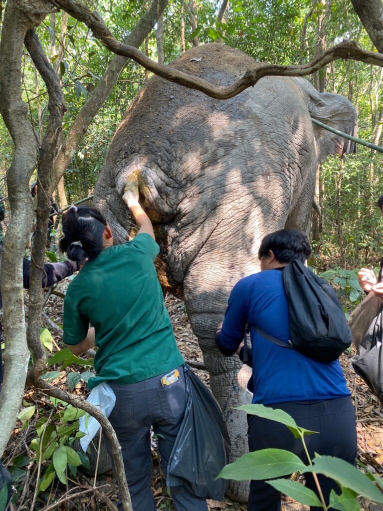 ทั้งนี้ “พลายเบี่ยงเล็ก” มีแผลที่ก้นซึ่งสัตว์แพทย์ยิงยาซึมเพื่อให้สามารถเข้ารักษาบาดแผลได้ โดยให้ยาปฏิชีวนะ ยาลดปวด วิตามิน และวัคซีนบาดทะยัก หลังจากนั้นจึงให้ยาแก้ฤทธิ์ยาซึมซึ่งช้างป่าฟื้นตัวดี