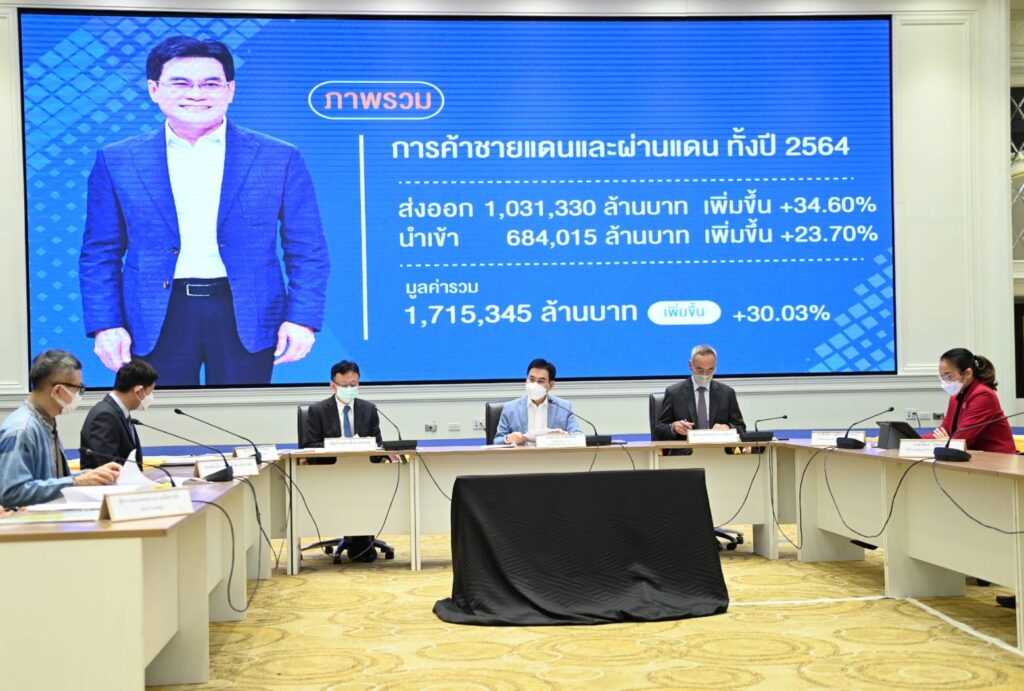 นนทบุรี 2 ก.พ.- รมว.พาณิชย์เผยยอดการส่งออกในส่วนของค้าผ่านชายแดนและผ่านแดนไทย ปี 64 ขยายตัวสูงถึง 34.60% แม้จะเจอพิษโควิดระบาด เชื่อแผนการตลาดและความต้องการสินค้าไทยจะดันยอดค้าชายแดนและผ่านแดนปี 65 เป็นบวก 5-7% ดึงเม็ดเงินสูงกว่า 1.8 ล้านล้านบาท