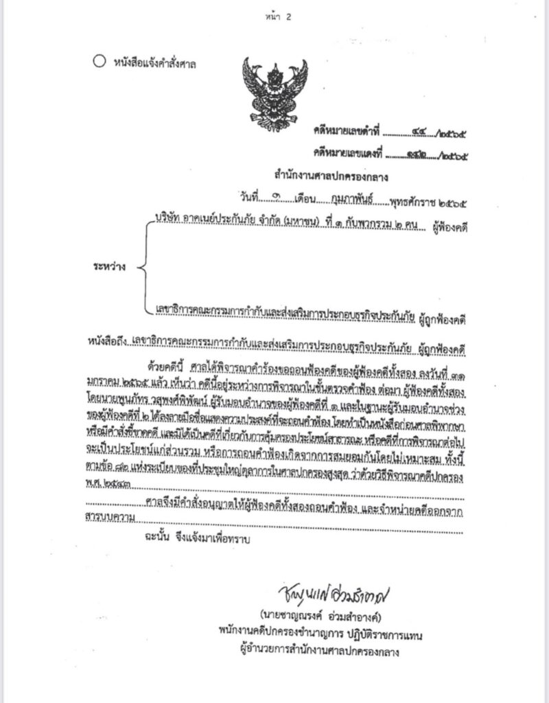 กรุงเทพฯ 2 ก.พ.- คปภ. รับทราบ คำสั่งศาลปกครองกลาง อาคเนย์ถอนฟ้องและจำหน่ายคดี ไม่มีคดีความ