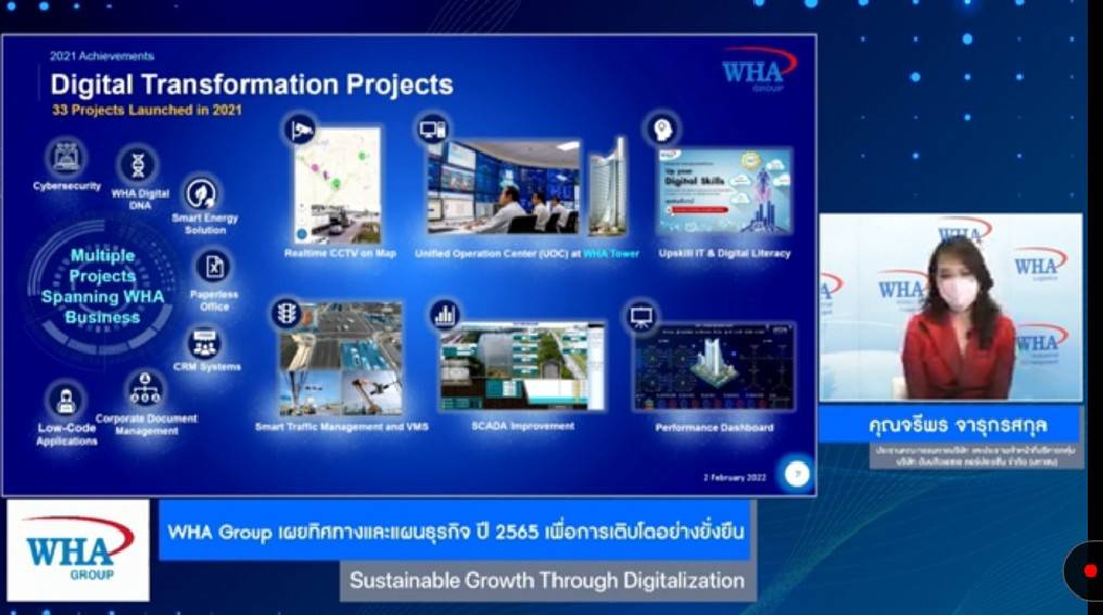นางสาวจรีพร จารุกรสกุล ประธานคณะกรรมการบริษัท และประธานเจ้าหน้าที่บริหารกลุ่ม บริษัท ดับบลิวเอชเอ คอร์ปอเรชั่น จำกัด (มหาชน) กล่าวว่าเพื่อเป็นการเพิ่มขีดความสามารถในการแข่งขันของดับบลิวเอชเอ เราได้นำเทคโนโลยีดิจิทัลเข้ามาปรับปรุงการดำเนินงานด้วยเป้าหมายทรานส์ฟอร์มแกนหลักของธุรกิจสู่ดิจิทัล ดับบลิวเอชเอ กรุ๊ปได้ริเริ่มโครงการเทคโนโลยีดิจิทัลขึ้นมาถึง 33 โครงการในปี 2564 และจะพัฒนาต่อเนื่องซึ่งเป็นส่วนหนึ่งของแผนโรดแมปของดับบลิวเอชเอ กรุ๊ป ที่ตั้งเป้าหมายจะก้าวเป็นบริษัทเทคโนโลยีให้ได้ภายในปี 2567