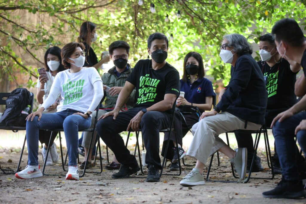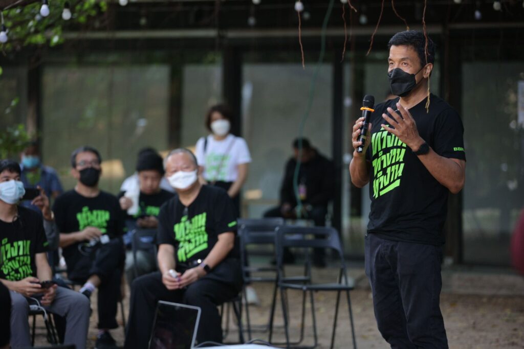 นายชัชชาติ สิทธิพันธุ์ ว่าที่ผู้สมัคร ผู้ว่าราชการ กทม. พร้อมด้วย ดร.เกษรา ธัญลักษณ์ภาคย์ หัวหน้าทีมนโยบายด้านเศรษฐกิจ เผยหัวข้อนโยบายเชิงประเด็นในงานฉลองปักหมุด “สภากาแฟ เพื่อน ชัชชาติ” ครบ 100 แห่ง ที่โครงการ The Jam Factory เขตคลองสาน มีดวงฤทธิ์ บุญนาค สถาปนิกและเจ้าของโครงการต้อนรับ